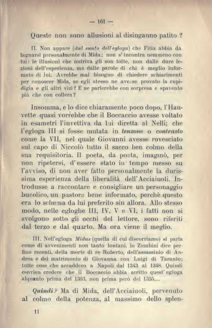 III. Nell'egloga Midas (quella di cui discorriamo) si parla come di avvenimenti non tanto lontani, lo Zumbini dice perfino recenti, della morte di re Roberto, dell'assassinio di Andrea e del matrimonio di Giovanna con Luigi di Taranto; tutte cose che accaddero a Napoli dal 1343 al 1348. Quindi convien credere che il Boccaccio abbia scritto quest' egloga alquanto prima del 1363, non prima però del 1355....