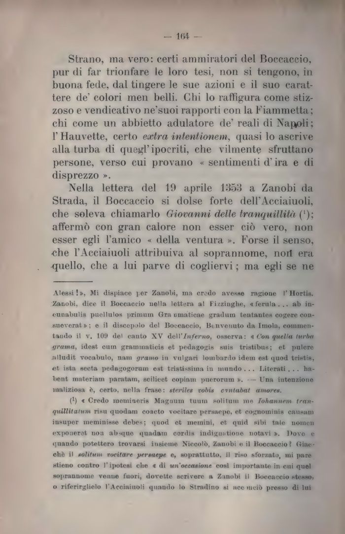 Strano, ma vero: certi ammiratori del Boccaccio, pur di far trionfare le loro tesi, non si tengono, in buona fede, dal tingere le sue azioni e il suo carattere de' colori men belli. Chi lo raffigura come stizzoso e vendicativo ne'suoi rapporti con la Fiammetta; chi come un abbietto adulatore de' reali di Naftoli; l'Hauvette, certo extra intentionem, quasi lo ascrive alla turba di quegl' ipocriti, che vilmente sfruttano persone, verso cui provano « sentimenti d'ira e di disprezzo ».