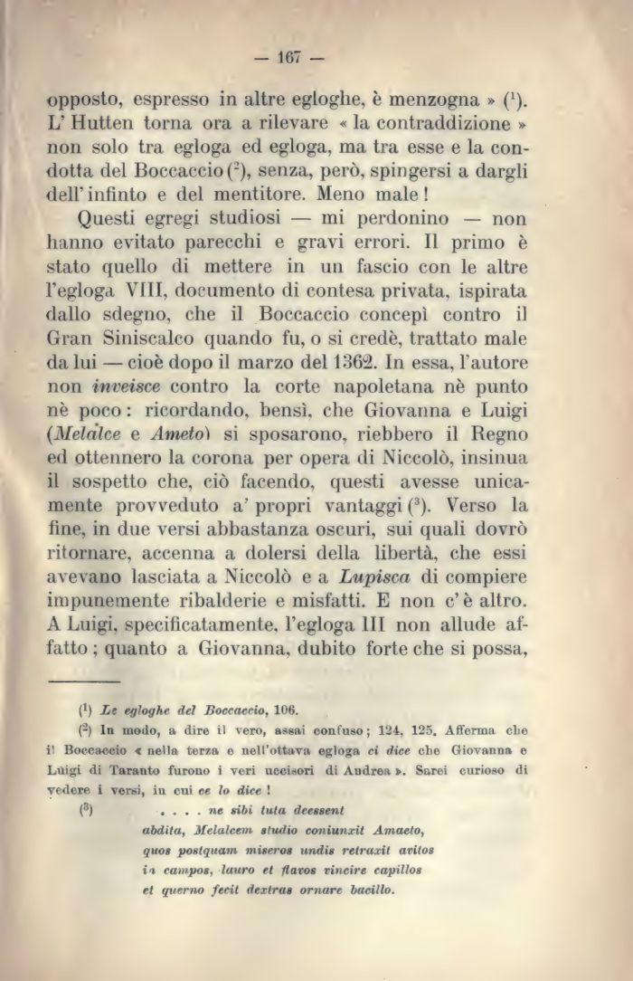 opposto, espresso in altre egloghe, è menzogna » ('). L' Hutten torna ora a rilevare « la contraddizione » non solo tra egloga ed egloga, ma tra esse e la condotta del Boccaccio (2), senza, però, spingersi a dargli dell'infinto e del mentitore. Meno male!