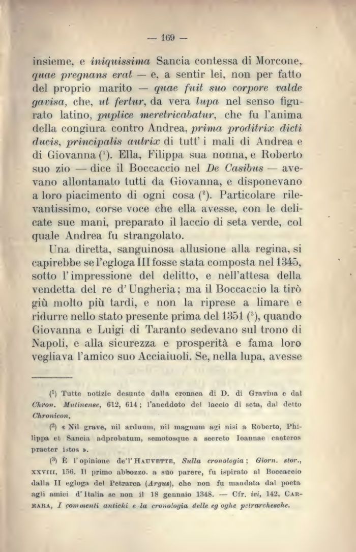 Una diretta, sanguinosa allusione alla regina, si capirebbe se l'egloga III fosse stata composta nel 1345, sotto l'impressione del delitto, e nell'attesa della vendetta del re d'Ungheria; ma il Boccaccio la tirò giù molto più tardi, e non la riprese a limare e ridurre nello stato presente prima del 1351 (3), quando Giovanna e Luigi di Taranto sedevano sul trono di Napoli, e alla sicurezza e prosperità e fama loro vegliava l'amico suo Acciainoli. Se, nella lupa, avesse