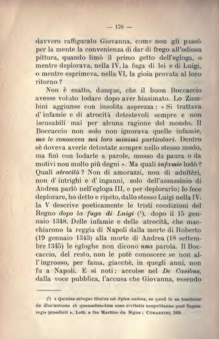 Non è esatto, dunque, che il buon Boccaccio avesse voluto lodare dopo aver biasimato. Lo Zumili ni aggiunse con insolita asprezza : « Si trattava d'infamie e di atrocità detestevoli sempre e non iscusabili mai per alcuna ragione del mondo. Il Boccaccio non solo non ignorava quelle infamie, ma le conosceva nei loro minimi particolari. Dentro sè doveva averle detestate sempre nello stesso modo, ma finì con lodarle a parole, mosso da paura o da motivi non molto più degni ». Ma quali infamie lodò ? Quali atrocità ? Non di amorazzi, non di adultèri, non d'intrighi e d'inganni, solo dell'assassinio di Andrea parlò nell'egloga III, e per deplorarlo; lo fece deplorare, ho detto e ripéto, dallo stesso Luigi nella IV: la V descrive poeticamente le tristi condizioni del Regno dopo la fuga di Luigi ('), dopo il 15 gennaio 1348. Delle infamie e delle atrocità, che macchiarono la reggia di Napoli dalla morte di Roberto (19 gennaio 1343) alla morte di Andrea (18 settembre 1345) le egloghe non dicono una parola. Il Boccaccio, del resto, non le potè conoscere se non all'ingrosso, per fama, giacche, in quegli anni, non fu a Napoli. E si noti : accolse nel De Casibus, dalla voce pubblica, l'accusa che Giovanna, essendo