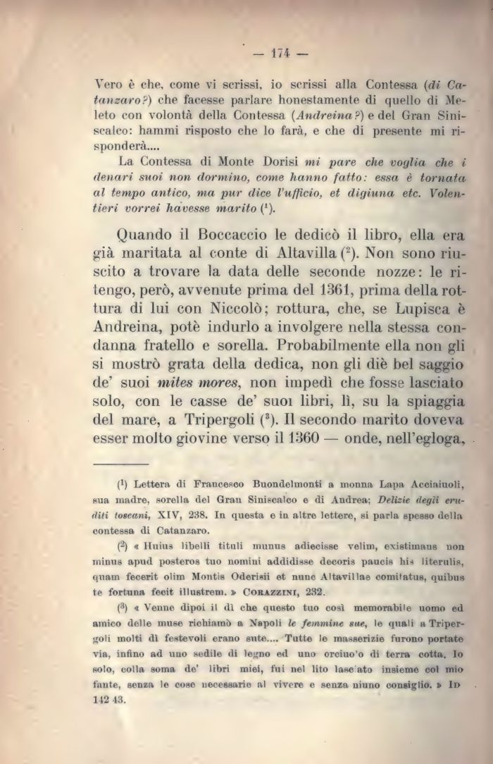 Quando il Boccaccio le dedicò il libro, ella era già maritata al conte di Altavilla (2). Non sono riuscito a trovare la data delle seconde nozze: le ritengo, però, avvenute prima del 1361, prima della rottura di lui con Niccolò; rottura, che, se Lupisca è Andreina, potè indurlo a involgere nella stessa condanna fratello e sorella. Probabilmente ella non gli si mostrò grata della dedica, non gli diè bel saggio de' suoi mites mores, non impedì che fosse lasciato solo, con le casse de' suoi libri, lì, su la spiaggia del mare, a Tripergoli (3). Il secondo marito doveva esser molto giovine verso il 1360 — onde, nell'egloga,