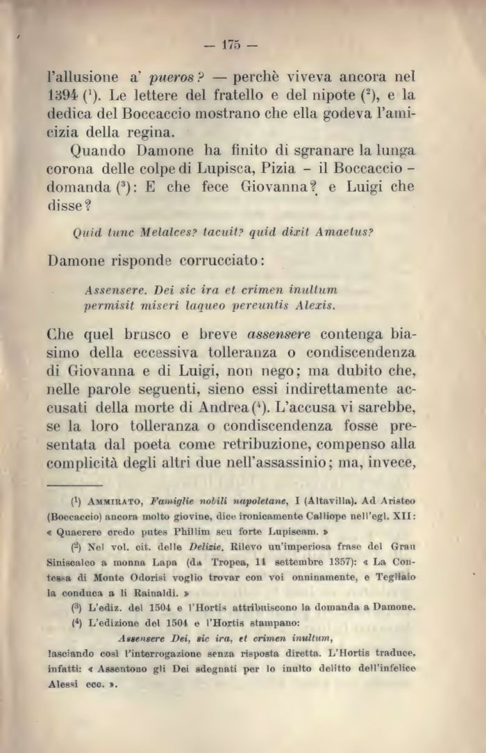 Che quel brusco e breve assensere contenga biasimo della eccessiva tolleranza o condiscendenza di Giovanna e di Luigi, non nego; ma dubito che, nelle parole seguenti, sieno essi indirettamente accusati della morte di Andrea (4). L'accusa vi sarebbe, se la loro tolleranza o condiscendenza fosse presentata dal poeta come retribuzione, compenso alla complicità degli altri due nell'assassinio ; ma, invece,