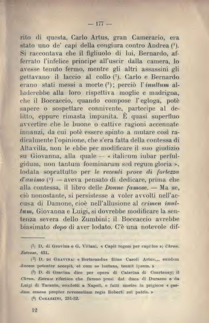 rito di questa, Carlo Artus, gran Camerario, era stato uno de' capi della congiura contro Andrea ('). Si raccontava cbe il figliuolo di lui, Bernardo, afferrato l'infelice principe all'uscir dalla camera, lo avesse tenuto fermo, mentre gli altri assassini gli gettavano il laccio al collo (2). Carlo e Bernardo erano stati messi a morte (3); perciò Y inultum alluderebbe alla loro rispettiva moglie e madrigna, cbe il Boccaccio, quando compose l'egloga, potè sapere o sospettare connivente, partecipe al delitto, eppure rimasta impunita. E quasi superfluo avvertire che le buone o cattive ragioni accennate innanzi, da cui potè essere spinto a mutare così radicalmente l'opinione, che s'era fatta della contessa di Altavilla, non le ebbe per modificare il suo giudizio su Giovanna, alla quale — « italicum iubar perful-gidum, non tantum foeminarum sed regum gloria », lodata soprattutto per le recenti prove di fortezza d'animo (4) — aveva pensato di dedicare, prima che alla contessa, il libro delle Donne famose. — Ma se, ciò nonostante, si persistesse a voler avvolti nell'accusa di Damone, cioè nell'allusione al crimen inid-tum, Giovanna e Luigi, si dovrebbe modificare la sentenza severa dello Zumbini; il Boccaccio avrebbe biasimato dopo di aver lodato. C'è una notevole dif-