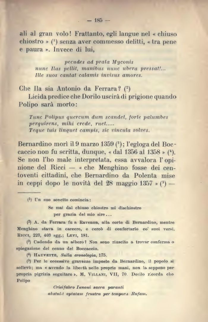 Bernardino morì il 9 marzo 1359 (8); l'egloga del Boccaccio non fu scritta, dunque, « dal 1356 al 1358 » (4). Se non l'ho male interpretata, essa avvalora 1' opinione del Ricci — « che Menghino fosse dei centoventi cittadini, che Bernardino da Polenta mise in ceppi dopo le novità del 28 maggio 1357 » (5) —