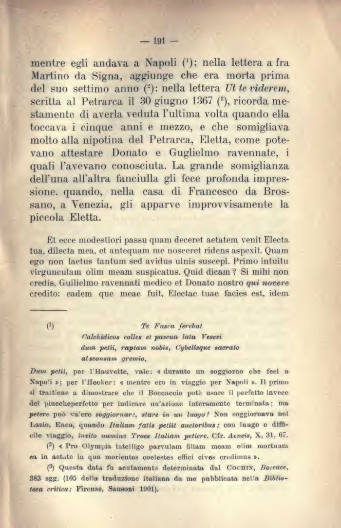 mentre egli andava a Napoli ('); nella lettera afra Martino da Signa, aggiunge che era morta prima del suo settimo anno ('-): nella lettera Ut teriderem, scritta al Petrarca il 30 giugno 1367 (3), ricorda mestamente di averla veduta l'ultima volta quando ella toccava i cinque anni e mezzo, e che somigliava molto alla nipotina del Petrarca, Eletta, come potevano attestare Donato e Guglielmo ravennate, i quali l'avevano conosciuta. La grande somiglianza dell'una all'altra fanciulla gli fece profonda impressione. quando, nella casa di Francesco da Bros-sano, a Venezia, gli apparve improvvisamente la piccola Eletta.
