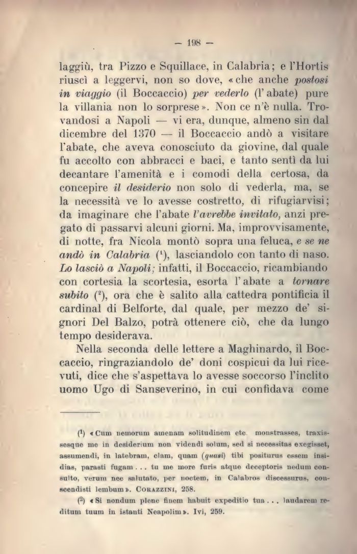 laggiù, tra Pizzo e Squillace, in Calabria; e l'Hortis riuscì a leggervi, non so dove, «che anche postosi in viaggio (il Boccaccio) per vederlo (l'abate) pure la villania non lo sorprese ». Non ce n'è nulla. Trovandosi a Napoli — vi era, dunque, almeno sin dal dicembre del 1370 — il Boccaccio andò a visitare l'abate, che aveva conosciuto da giovine, dal quale fu accolto con abbracci e baci, e tanto sentì da lui decantare l'amenità e i comodi della certosa, da concepire il desiderio non solo di vederla, ma, se la necessità ve lo avesse costretto, di rifugiarvisi ; da imaginare che l'abate l'avrebbe invitato, anzi pregato di passarvi alcuni giorni. Ma, improvvisamente, di notte, fra Nicola montò sopra una feluca, e se ne andò in Calabria (L), lasciandolo con tanto di naso. Lo lasciò a Napoli; infatti, il Boccaccio, ricambiando con cortesia la scortesia, esorta l'abate a tornare subito (2), ora che è salito alla cattedra pontificia il cardinal di Belforte, dal quale, per mezzo de' signori Del Balzo, potrà ottenere ciò, che da lungo tempo desiderava.