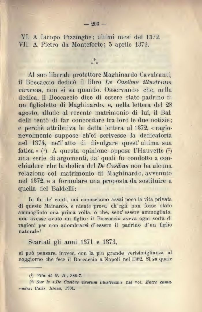 Al suo liberale protettore Maghinardo Cavalcanti, il Boccaccio dedicò il libro De Casibns illustrium virorum, non si sa quando. Osservando che, nella dedica, il Boccaccio dice di essere stato padrino di un figlioletto di Maghinardo, e, nella lettera del 28 agosto, allude al recente matrimonio di lui, il Bal-delli tentò di far concordare tra loro le due notizie; e perchè attribuiva la detta lettera al 1372, « ragionevolmente suppose ch'ei scrivesse la dedicatoria nel 1374, nell'atto di divulgare quest'ultima sua fatica » (t). A questa opinione oppose l'Hauvette (2) una serie di argomenti, da' quali fu condotto a conchiudere che la dedica del De Gasibus non ha alcuna relazione col matrimonio di Maghinardo, avvenuto nel 1372, e a formulare una proposta da sostituire a quella del Baldelli: