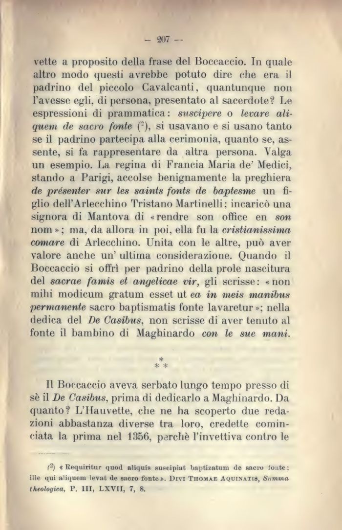 vette a proposito della frase del Boccaccio. In quale altro modo questi avrebbe potuto dire che era il padrino del piccolo Cavalcanti, quantunque non l'avesse egli, di persona, presentato al sacerdote? Le espressioni di prammatica: suscipere o levare ali-quem de sacro fonte (°), si usavano e si usano tanto se il padrino partecipa alla cerimonia, quanto se, assente, si fa rappresentare da altra persona. Valga un esempio. La regina di Francia Maria de' Medici, stando a Parigi, accolse benignamente la preghiera de présenter sur les saints fonts de baptesme un figlio dell'Arlecchino Tristano Martinelli; incaricò una signora di Mantova di «rendre son office en son nom » ; ma, da allora in poi, ella fu la cristianissima comare di Arlecchino. Unita con le altre, può aver valore anche un' ultima considerazione. Quando il Boccaccio si offrì per padrino della prole nascitura del sacrae famis et angelicae vir, gli scrisse : « non mihi modicum gratum esset ut ea in meis manibus permanente sacro baptismatis fonte lavaretur »; nella dedica del De Casibus, non scrisse di aver tenuto al