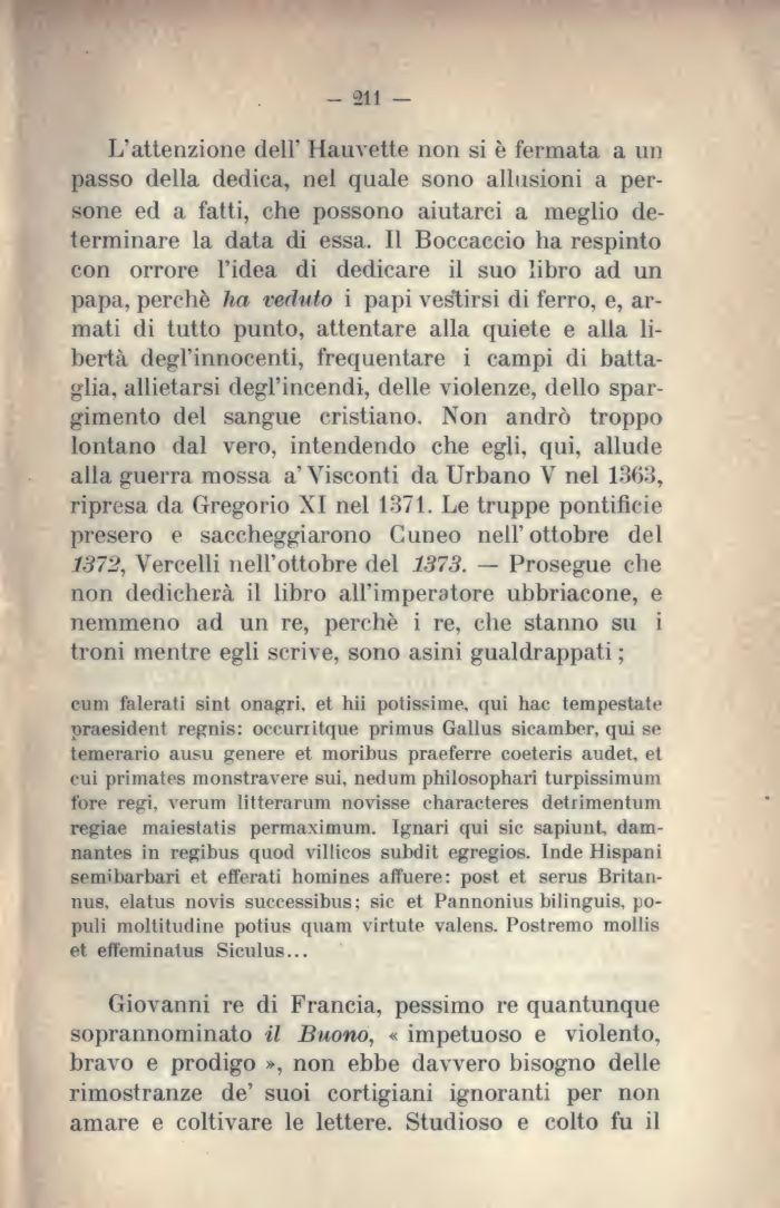 L'attenzione dell' Hauvette non si è fermata a un passo della dedica, nel quale sono allusioni a persone ed a fatti, che possono aiutarci a meglio determinare la data di essa. Il Boccaccio ha respinto con orrore l'idea di dedicare il suo libro ad un papa, perchè ha veduto i papi vestirsi di ferro, e, armati di tutto punto, attentare alla quiete e alla libertà degl'innocenti, frequentare i campi di battaglia, allietarsi degl'incendi, delle violenze, dello spargimento del sangue cristiano. Non andrò troppo lontano dal vero, intendendo che egli, qui, allude alla guerra mossa a' Visconti da Urbano V nel 1363, ripresa da Gregorio XI nel 1371. Le truppe pontifìcie presero e saccheggiarono Cuneo nell'ottobre del 1372, Vercelli nell'ottobre del 1373. — Prosegue che non dedicherà il libro all'imperatore ubbriacone, e nemmeno ad un re, perchè i re, che stanno su i troni mentre egli scrive, sono asini gualdrappati ;