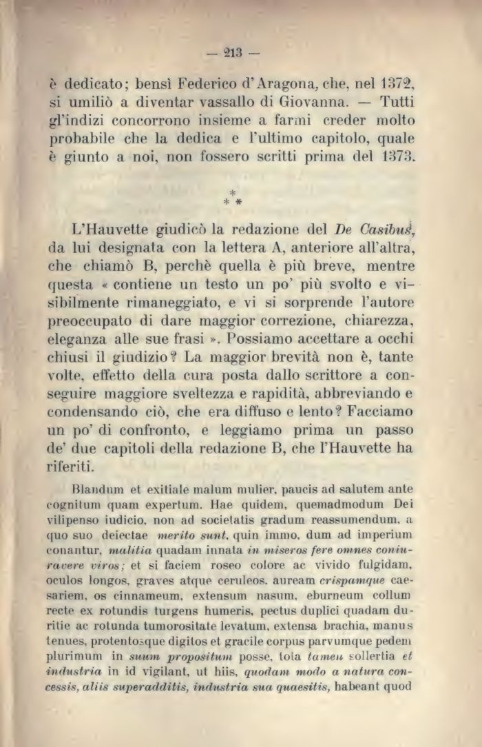 L'Hauvette giudicò la redazione del De Casibud, da lui designata con la lettera A, anteriore all'altra, che chiamò B, perchè quella è più breve, mentre questa « contiene un testo un po' più svolto e visibilmente rimaneggiato, e vi si sorprende l'autore preoccupato di dare maggior correzione, chiarezza, eleganza alle sue frasi ». Possiamo accettare a occhi chiusi il giudizio? La maggior brevità non è, tante volte, effetto della cura posta dallo scrittore a conseguire maggiore sveltezza e rapidità, abbreviando e condensando ciò, che era diffuso e lento? Facciamo un po' di confronto, e leggiamo prima un passo de' due capitoli della redazione B, che l'Hauvette ha riferiti.