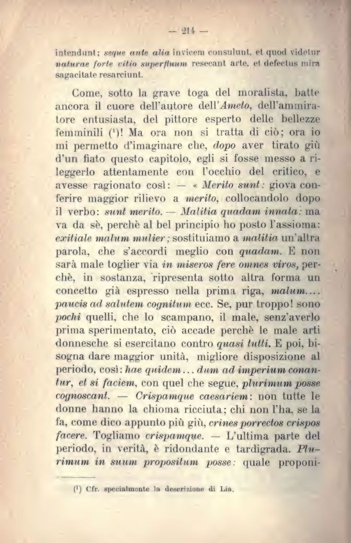 Come, sotto la grave toga del moralista, batte ancora il cuore dell'autore delVAmeto, dell'ammiratore entusiasta, del pittore esperto delle bellezze femminili (')! Ma ora non si tratta di ciò; ora io mi permetto d'imaginare che, dopo aver tirato giù d'un fiato questo capitolo, egli si fosse messo a rileggerlo attentamente con l'occhio del critico, e avesse ragionato così : — « Merito sunt : giova conferire maggior rilievo a merito, collocandolo dopo il verbo: sunt merito. — Malitia quadam innata: ma va da se, perchè al bel principio ho posto l'assioma: exitiale malum mulier; sostituiamo a malitia un'altra parola, che s'accordi meglio con quadam. E non sarà male toglier via in miseros fere omnes viros, perchè, in sostanza, 'ripresenta sotto altra forma un concetto già espresso nella prima riga, malum— paucisad salutem cognitum ecc. Se, pur troppo! sono pochi quelli, che lo scampano, il male, senz'averlo prima sperimentato, ciò accade perchè le male arti donnesche si esercitano contro quasi tutti. E poi, bisogna dare maggior unità, migliore disposizione al periodo, così: hae quidam... dum ad imperium conan-tur, et si faciem, con quel che segue, plurimum posse cognoscant. — Crispamque caesariem: non tutte le donne hanno la chioma ricciuta; chi non l'ha, se la fa, come dico appunto più giù, crines porrectos crispos facere. Togliamo crispamque. — L'ultima parte del periodo, in verità, è ridondante e tardigrada. Plurimum in suum propositum posse: quale proponi-