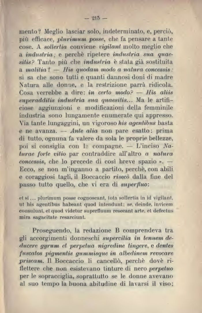 mento ? Meglio lasciar solo, indeterminato, e, perciò, più efficace, plurimum posse, che fa pensare a tante cose. A sollertia conviene vigilant molto meglio che a industria; e perchè ripetere industria sua quae-sitis? Tanto più che industria è stata già sostituita a malitia ? — His quodam modo a natura concessis : si sa che sono tutti e quanti dannosi doni di madre Natura alle donne, e la restrizione parrà ridicola. Cosa verrebbe a dire: in certo modo? — His aliis superadditis industria sua quaesitis... Ma le artificiose aggiunzioni e modificazioni della femminile industria sono lungamente enumerate qui appresso. Via tante lungaggini, un vigoroso his agentibus basta e ne avanza. — Ante alia non pare esatto: prima di tutto, ognuna fa valere da sola le proprie bellezze, poi si consiglia con ls compagne. — L'inciso Na-turae forte vitio par contraddire all'altro a natura concessis, che lo precede di così breve spazio ». — Ecco, se non m'inganno a partito, perchè, con abili e coraggiosi tagli, il Boccaccio risecò dalla fine del passo tutto quello, che vi era di superfluo: