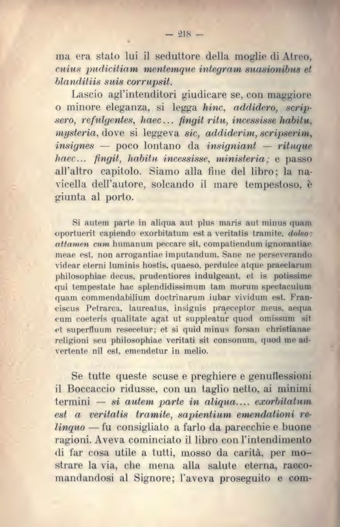 Lascio agl'intenditori giudicare se, con maggiore o minore eleganza, si legga hinc, addidero, scrip-sero, refulgentes, haec... fingit ritu, incessisse habitu, mysteria, dove si leggeva sic, addiderim, scripserim, insignes — poco lontano da insigniant — rituque haec... fingit, liabitn incessisse, ḿnisteria; e passo all'altro capitolo. Siamo alla fine del libro; la navicella dell'autore, solcando il mare tempestoso, è giunta al porto.