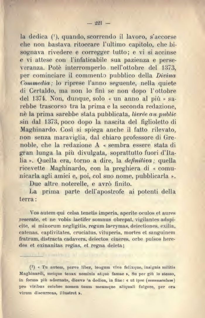la dedica ('), quando, scorrendo il lavoro, s'accorse che non bastava ritoccare l'ultimo capitolo, che bisognava rivedere e corregger tutto; e vi si accinse e vi attese con l'infaticabile sua pazienza e perseveranza. Potè interromperlo nell'ottobre del 1373, per cominciare il commento pubblico della Divina Commedia; lo riprese l'anno seguente, nella quiete di Certaldo, ma non lo finì se non dopo l'ottobre del 1374. Non, dunque, solo « un anno al più » sarebbe trascorso tra la prima e la seconda redazione, nè la prima sarebbe stata pubblicata, livree a u public sin dal 1373, poco dopo la nascita del figlioletto di Maghinardo. Così si spiega anche il fatto rilevato, non senza maraviglia, dal chiaro professore di Grenoble, che la redazione A « sembra essere stata di gran lunga la più divulgata, soprattutto fuori d'Italia ». Quella era, torno a dire, la definitiva; quella ricevette Maghinardo, con la preghiera di « comunicarla agli amici e, poi, col suo nome, pubblicarla ». ![]() |