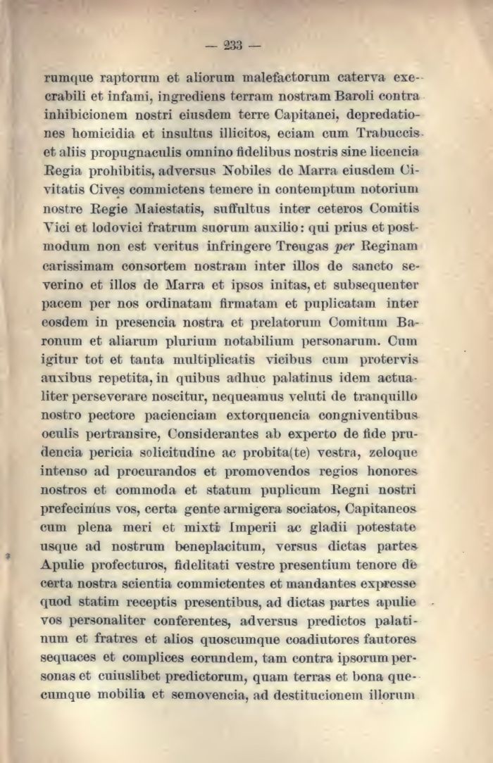rumque raptornm et aliorum malefactorum caterva exe-crabili et infami, ingrediens terram nostrani Baroli contra inhibicionem nostri eiusdem terre Capitanei. depredatio-nes homicidia et insultus illicitos, eciarn cnm Trabuccis et aliis propugnaculis omnino tědelibus nostris sine licencia Regia proliibitis, adversns Xobiles de Marra eiusdem (Ji-vitatis Cives commictens temere in contemptum notorium nostre Regie Maiestatis, suffaltus inter ceteros Comitis Vici et lodovici fratrum suorum auxilio : qui prius et post-modum non est veritus infringere Trengas per Reginam carissimam consortem nostrani inter illos de sancto se-verino et illos de Marra et ipsos initas, et subsequenter pacem per nos ordinatam firmatam et pnplicatam inter eosdein in presencia nostra et prelatorum Comitnm Ba-ronmn et aliainm plnrinm notabilium personarum. Cnm igitur tot et tanta multiplicatis vicibus cmn yirotervis anxibus repetita, in qnibus adhuc palatinus idem actua-liter perseverare noscitur, nequeamus veluti de tranquillo nostro pectore pacienciam extorqnencia congniventibus ocnlis pertransire, Considerantes ab experto de Ade prn-(iencia pericia solicitndine ac probita(te) vestra, zeloque intenso ad procurandos et promovendos regios honores nostros et commoda et statum puplicum Regni nostri prefecinius vos, certa gente armigera sociatos, Capitaneos cum piena meri et mixti Imperii ac gladii potestate usque ad nostrum beneplacitnm, versus dictas parte» Apulie profectnros, fldelitati vestre presentium tenore de certa nostra scientia commictentes et maridantes exiwesse qnod statim receptis presentibus, ad dictas partes apulie vos personaliter conferentes, adversns predictos palati-nnm et fratres et alios quoscumque coadiutores fautores sequaces et complices eorundem, tani contra ipsorum per-sonas et cuiuslibet predictorum, quam terras et bona que-cnmque mobilia et semovencia, ad destitncionem illorum