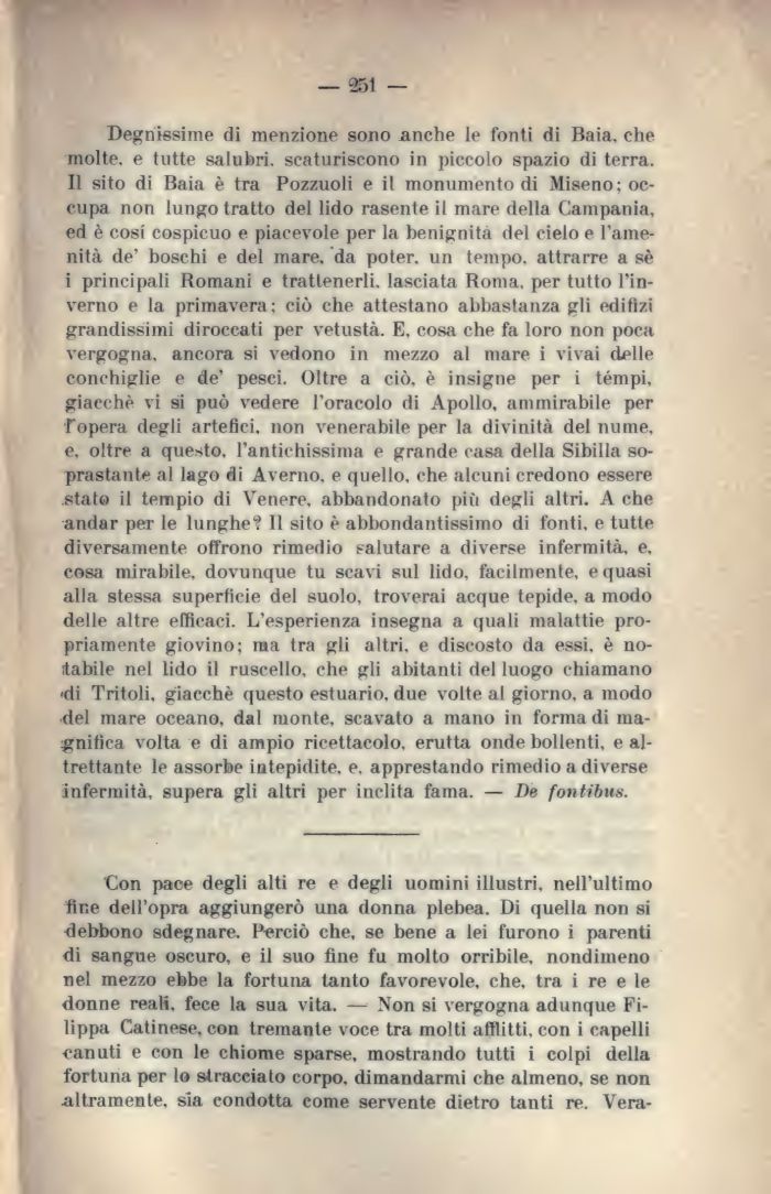 Degnissime di menzione sono anche le fonti di Baia, che molte, e tutte salubri, scaturiscono in piccolo spazio di terra. 11 sito di Baia è tra Pozzuoli e il monumento di Miseno; occupa non lungo tratto del lido rasente il mare della Campania, ed è cosi cospicuo e piacevole per la benignità del cielo e l'amenità de' boschi e del mare, da poter, un tempo, attrarre a sè i principali Romani e trattenerli. lasciata Roma, per tutto l'inverno e la primavera ; ciò che attestano abbastanza gli edifizi grandissimi diroccati per vetustà. E, cosa che fa loro non poca vergogna, ancora si vedono in mezzo al mare i vivai delle conchiglie e de' pesci. Oltre a ciò, è insigne per i tempi, giacché vi si può vedere l'oracolo di Apollo, ammirabile per Coperà degli artefici, non venerabile per la divinità del nume, e, oltre a questo, l'antichissima e grande casa della Sibilla soprastante al lago di Averno, e quello, che alcuni credono essere stato il tempio di Venere, abbandonato più degli altri. A che andar per le lunghe? Il sito è abbondantissimo di fonti, e tutte diversamente offrono rimedio salutare a diverse infermità, e, cosa mirabile, dovunque tu scavi sul lido, facilmente, e quasi alla stessa superficie del suolo, troverai acque tepide, a modo delle altre efficaci. L'esperienza insegna a (piali malattie propriamente giovino; ma tra gli altri, e discosto da essi, è notabile nel lido il ruscello, che gli abitanti del luogo chiamano >di Tritoli, giacché questo estuario, due volte al giorno, a modo del mare oceano, dal monte, scavato a mano in forma di magnifica volta e di ampio ricettacolo, erutta onde bollenti, e altrettante le assorbe intepidite, e. apprestando rimedio a diverse infermità, supera gli altri per inclita fama. — De fontibus.