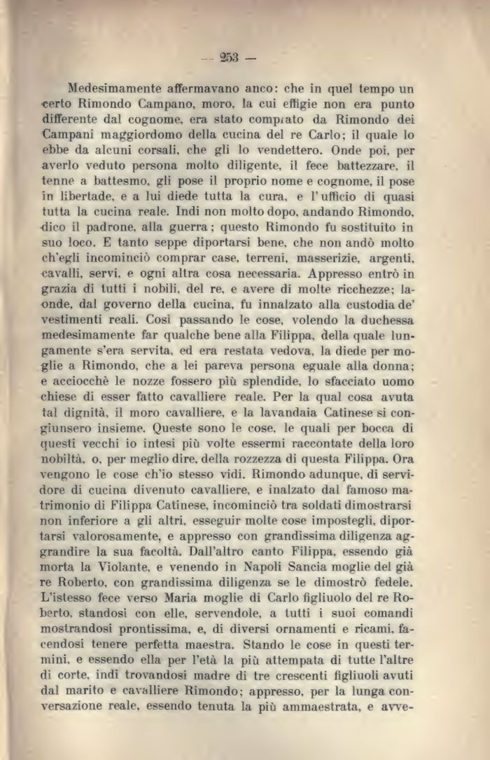 Medesimamente affermavano anco: che in quel tempo un •certo Rimondo Campano, moro, la cui effigie non era punto differente dal cognome, era stato compi ato da Rimondo dei Campani maggiordomo della cucina del re Carlo; il quale lo ebbe da alcuni corsali, che gli lo vendettero. Onde poi, per averlo veduto persona molto diligente, il fece battezzare, il tenne a battesmo, gli pose il proprio nome e cognome, il pose in libertade, e a lui diede tutta la cura, e l'ufficio di quasi tutta la cucina reale. Indi non molto dopo, andando Rimondo, dico il padrone, alla guerra ; questo Rimondo fu sostituito in suo loco. E tanto seppe diportarsi bene, che non andò molto ch'egli incominciò comprar case, terreni, masserizie, argenti, cavalli, servi, e ogni altra cosa necessaria. Appresso entrò in grazia di tutti i nobili, del re, e avere di molte ricchezze; laonde, dal governo della cucina, fu innalzato alla custodia de' vestimenti reali. Così passando le cose, volendo la duchessa medesimamente far qualche bene alla Filippa, della quale lungamente s'era servita, ed era restata vedova, la diede per moglie a Rimondo, che a lei pareva persona eguale alla donna; e acciocché le nozze fossero più splendide, lo sfacciato uomo chiese di esser fatto cavalliere reale. Per la qual cosa avuta tal dignità, il moro cavalliere, e la lavandaia Catinese si congiunsero insieme. Queste sono le cose, le quali per bocca di questi vecchi io intesi più volte essermi raccontate della loro nobiltà, o, per meglio dire, della rozzezza di questa Filippa. Ora vengono le cose ch'io stesso vidi. Rimondo adunque, di servidore di cucina divenuto cavalliere, e inalzato dal famoso matrimonio di Filippa Catinese, incominciò tra soldati dimostrarsi non inferiore a gli altri, esseguir molte cose impostegli, diportarsi valorosamente, e appresso con grandissima diligenza aggrandire la sua facoltà. Dall'altro canto Filippa, essendo già morta la Violante, e venendo in Napoli Sancia moglie del già re Roberto, con grandissima diligenza se le dimostrò fedele. L'islesso fece verso Maria moglie di Carlo figliuolo del re Roberto, standosi con elle, servendole, a tutti i suoi comandi mostrandosi prontissima, e, di diversi ornamenti e ricami, facendosi tenere perfetta maestra. Stando le cose in questi termini, e essendo ella per l'età la più attempata di tutte l'altre di corte, indi trovandosi madre di tre crescenti figliuoli avuti dal marito e cavalliere Rimondo ; appresso, per la lunga conversazione reale, essendo tenuta la più ammaestrata, e awe-