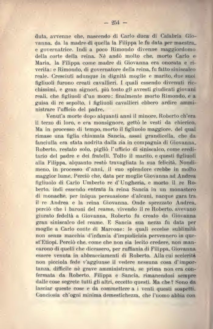 duta. avvenne che, nascendo di Carlo duca di' Calabria Giovanna. da la madre di quella la Filippa le fu data per maestra,, e governatrice. Indi a poco Rimondo divenne maggiordomo della corte della reina. Nè andò mollo che, morto Carlo e Maria, la Filippa come madre di Giovanna era onorata e riverita: e Rimondo, di governatore della reina, fu fatto siniscalco reale. Cresciuti adunque in dignità moglie e marito, due suoi figliuoli furono creati cavallieri. I quali essendo divenuti ricchissimi, e gran signori, più tosto gli avresti giudicati giovani reali, che figliuoli d'un moro : finalmente morto Rimondo, e a guisa di re sepolto, i figliuoli cavallieri ebbero ardire amministrare l'ufficio del padre.
