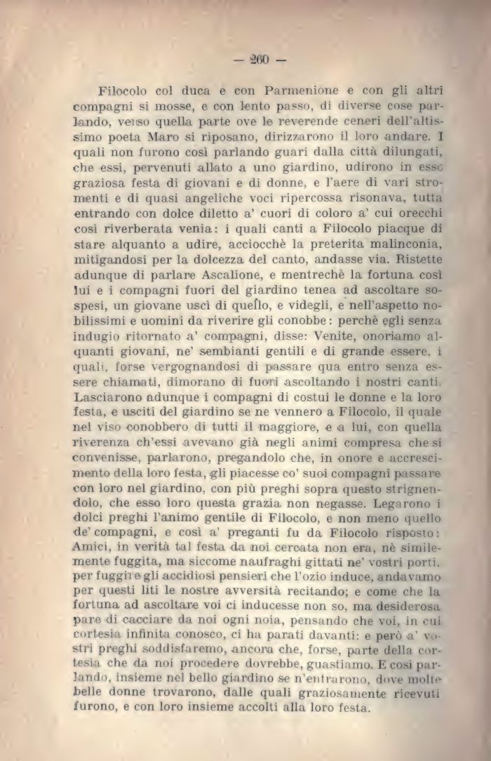 Filocolo col duca e con Parmenione e con gli altri compagni si mosse, e con lento passo, di diverse cose parlando, venso quella parte ove le reverende ceneri dell'altissimo poeta Maro si riposano, dirizzarono il loro andare. I quali non furono così parlando guari dalla città dilungati, che essi, pervenuti .allato a uno giardino, udirono in esso graziosa festa di giovani e di donne, e l'aere di vari stro-menti e di quasi angeliche voci ripercossa risonava, tutta entrando con dolce diletto a' cuori di coloro a' cui orecchi così riverberata venia: i quali canti a Filocolo piacque di stare alquanto a udire, acciocché la preterita malinconia, mitigandosi per la dolcezza del canto, andasse via. Ristette adunque di parlare Ascalione, e mentrechè la fortuna così lui e i compagni fuori del giardino tenea ad ascoltare sospesi, un giovane uscì di quello, e videgli, e nell'aspetto nobilissimi e uomini da riverire gli conobbe : perchè egli senza indugio ritornato a' compagini, disse: Venite, onoriamo alquanti giovani, ne' sembianti gentili e di grande essere, i quali, forse vergognandosi di passare qua entro senza essere chiamati, dimorano di fuoTi ascoltando i nostri canti. Lasciarono adunque i compagni di costui le donne e la loro festa, e usciti del giardino se ne vennero a Filocolo, il quale nel viso conobbero di tutti il maggiore, e .a lui, con quella riverenza ch'essi avevano già negli animi compresa che si convenisse, parlarono, pregandolo che, in onore e accrescimento della loro festa, gli piacesse co' suoi compagni passare con loro nel giardino, con più preghi sopra questo strignen-dolo, che esso loro questa grazia non negasse. Legarono i dolci preghi l'animo gentile di Filocolo, e non meno quello de' compagni, e così a' preganti fu da Filocolo risposto : Amici, in verità tal festa da noi cercata non era, nè simile-mente fuggita, ma siccome naufraghi gittati ne' vostri porti, per fuggii e gli accidiosi pensieri che l'ozio induce, andavamo per questi liti le nostre avversità recitando; e come che la fortuna ad ascoltare voi ci inducesse non so, ma desiderosa pare di cacciare da noi ogni noia, pensando che voi, in cui cortesia infinita conosco, ci ha parati davanti: e però a' vostri preghi soddisfaremo, ancora che, forse, parte della cortesia che da noi procedere dovrebbe, guastiamo. E cosi parlando, insieme nel bello giardino se n'entrarono, dove molte belle donne trovarono, dalle quali graziosamente ricevuti furono, e con loro insieme accolti alla loro festa.