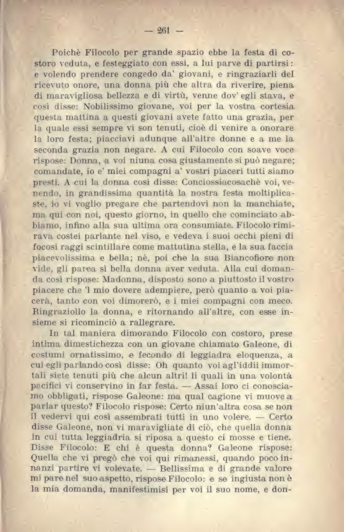 In tal maniera dimorando Filocolo con costoro, prese intima dimestichezza con un giovane chiamato Galeone, di costumi ornatissimo, e fecondo di leggiadra eloquenza, a cui egli pai landò così disse: Oh quanto voi agl'iddìi immortali siete tenuti più che alcun altri! li quali in una volontà pacifici vi conservino in far festa. — Assai loro ci conosciamo obbligati, rispose Galeone: ma qual cagione vi muove a parlar questo? Filocolo rispose: Certo niun'altra cosa se non il vedervi qui così assembrati tutti in uno volere. — Certo disse Galeone, non vi maravigliate di ciò, che quella donna in cui tutta leggiadria si riposa a questo ci mosse e tiene. Disse Filocolo: E chi è questa donna? Galeone rispose: Quella che vi pregò che voi qui rimanessi, quando poco innanzi partire vi volevate. — Bellissima e di grande valore mi pare nel suo aspetto, rispose Filocolo: e se ingiusta non è la mia domanda, manifestimisi per voi il suo nome, e don-