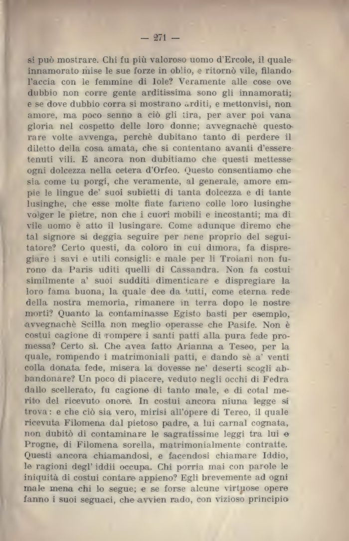 si può mostrare. Chi fu più valoroso uomo d'Ercole, il quale-innamorato mise le sue forze in oblio, e ritornò vile, filando l'accia con le femmine di Iole? Veramente alle cose ove dubbio non corre gente arditissima sono gli innamorati; e se dove dubbio corra si mostrano arditi, e mettonvisi, non amore, ma poco senno a ciò gli tira, per aver poi vana gloria nel cospetto delle loro donne; avvegnaché questa rare volte avvenga, perchè dubitano tanto di perdere il diletto della cosa amata, che si contentano avanti d'essere tenuti vili. E ancora non dubitiamo che questi mettesse ogni dolcezza nella oetera d'Orfeo. Questo consentiamo che sia come tu porgi, che veramente, al generale, amore empie le lingue de' suoi subietti di tanta dolcezza e di tante lusinghe, che esse molte fiate farieno colle loro lusinghe volger le pietre, non che i cuori mobili e incostanti; ma di vile uomo è atto il lusingare. Come adunque diremo che tal signore si deggia seguire per nene proprio del segui-tatore? Certo questi, da coloro in cui dimora, fa dispregiare i savi e utili consigli: e male per li Troiani non furono da Paris uditi quelli di Cassandra. Non fa costui similmente a' suoi sudditi dimenticare e dispregiare la loro fama buona, la quale dee da tutti, come eterna rede della nostra memoria, rimanere in terra dopo le nostre morti? Quanto la contaminasse Egisto basti per esemplo, avvegnaché Scilla non meglio operasse che Pasife. Non è costui cagione di rompere i santi patti alla pura fede promessa? Certo sì. Che avea fatto Arianna a Teseo, per la quale, rompendo i matrimoniali patti, e dando sè a' venti colla donata fede, misera la dovesse ne' deserti scogli abbandonare? Un poco di piacere, vedut ![]() |