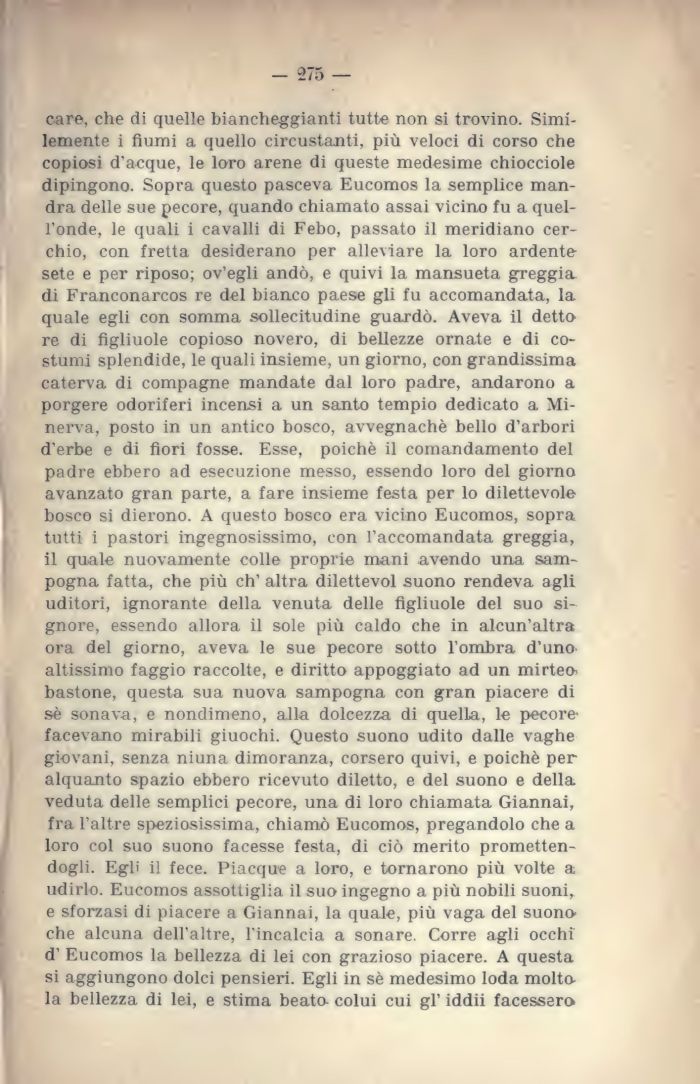 care, che di quelle biancheggianti tutte non si trovino. Simi-lemente i fiumi a quello circustanti, più veloci di corso che copiosi d'acque, le loro arene di queste medesime chiocciole dipingono. Sopra questo pasceva Eucomos la semplice man-dra delle sue pecore, quando chiamato assai vicino fu a quell'onde, le quali i cavalli di Febo, passato il meridiano cerchio, con fretta desiderano per alleviare la loro ardente sete e per riposo; ov'egli andò, e quivi la mansueta greggia di Franconarcos re del bianco paese gli fu accomandata, la quale egli con somma sollecitudine guardò. Aveva il detto re di figliuole copioso novero, di bellezze ornate e di costumi splendide, le quali insieme, un giorno, con grandissima caterva di compagne mandate dal loro padre, andarono a porgere odoriferi incensi a un santo tempio dedicato a Minerva, posto in un antico bosco, avvegnaché bello d'arbori d'erbe e di fiori fosse. Esse, poiché il comandamento del padre ebbero ad esecuzione messo, essendo loro del giorno avanzato gran parte, a fare insieme festa per lo dilettevole bosco si dierono. A questo bosco era vicino Eucomos, sopra tutti i pastori ingegnosissimo, con l'accomandata greggia, il quale nuovamente colle proprie mani avendo una sam-pogna fatta, che più eh' altra dilettevol suono rendeva agli uditori, ignorante della venuta delle figliuole del suo signore, essendo allora il sole più caldo che in alcun'altra ora del giorno, aveva le sue pecore sotto l'ombra d'uno< altissimo faggio raccolte, e diritto appoggiato ad un mirtea bastone, questa sua nuova sampogna con gran piacere di sé sonava, e nondimeno, alla dolcezza di quella, le pecore' facevano mirabili giuochi. Questo suono udito dalle vaghe giovani, senza niuna dimoranza, corsero quivi, e poiché per alquanto spazio ebbero ricevuto diletto, e del suono e della veduta delle semplici pecore, una di loro chiamata Giannai, fra l'altre speziosissima, chiamò Eucomos, pregandolo che a loro col suo suono facesse festa, di ciò merito promettendogli. Egli il fece. Piacque a loro, e tornarono più volte a udirlo. Eucomos assottiglia il suo ingegno a più nobili suoni, e sforzasi di piacere a Giannai, la quale, più vaga del suono-che alcuna dell'altre, l'incalcia a sonare. Corre agli occhi d' Eucomos la bellezza di lei con grazioso piacere. A questa si aggiungono dolci pensieri. Egli in sé medesimo loda molta la bellezza di lei, e stima beata colui cui gì' iddii facessero ![]() |