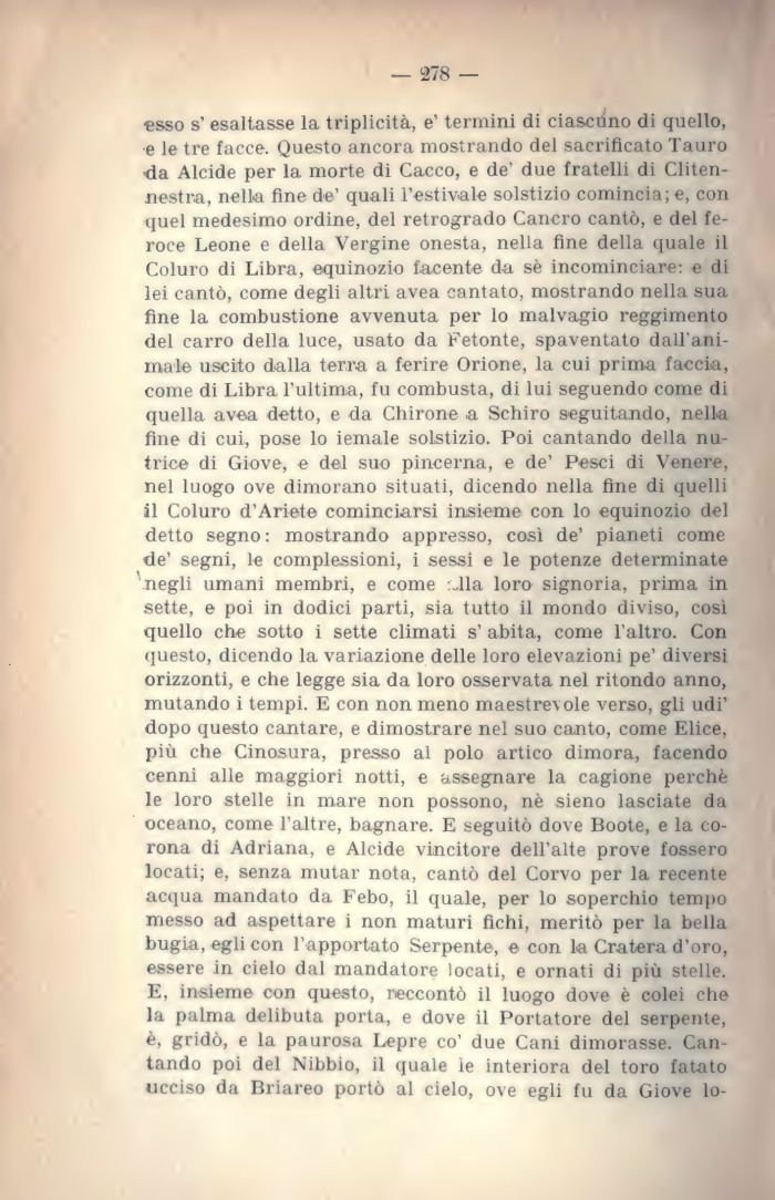 esso s' esaltasse la triplicità, e' termini di ciascuno di quello, e le tre facce. Questo ancora mostrando del sacrificato Tauro •da Alcide per la morte di Cacco, e de' due fratelli di Cliten-nestra, nella fine de' quali l'estivale solstizio comincia; e, con quel medesimo ordine, del retrogrado Cancro cantò, e del feroce Leone e della Vergine onesta, nella fine della quale il Coluro di Libra, equinozio facente da sè incominciare: e di lei cantò, come degli altri avea cantato, mostrando nella sua fine la combustione avvenuta per lo malvagio reggimento del carro della luce, usato da Fetonte, spaventato dall'animale uscito dalla terra a ferire Orione, la cui prima faccia, come di Libra l'ultima, fu combusta, di lui seguendo come di quella avea detto, e da Chirone a Schiro seguitando, nella fine di cui, pose lo iemale solstizio. Poi cantando della nutrice di Giove, e del suo pincerna, e de' Pesci di Venere, nel luogo ove dimorano situati, dicendo nella fine di quelli il Coluro d'Ariete cominciarsi insieme con lo equinozio del detto segno : mostrando appresso, così de' pianeti come de' segni, le complessioni, i sessi e le potenze determinate negli umani membri, e come :Jla loro signoria, prima in sette, e poi in dodici parti, sia tutto il mondo diviso, così quello che sotto i sette climati s' abita, come l'altro. Con questo, dicendo la variazione delle loro elevazioni pe' diversi orizzonti, e che legge sia da loro osservata nel ritondo anno, mutando i tempi. E con non meno maestrevole verso, gli udi' dopo questo cantare, e dimostrare nel suo canto, come Elice, più che Cinosura, presso al polo artico dimora, facendo cenni alle maggiori notti, e assegnare la cagione perchè le loro stelle in mare non possono, nè sieno lasciate da oceano, come l'altre, bagnare. E seguitò dove Boote, e la corona di Adriana, e Alcide vincitore dell'alte prove fossero locati; e, senza mutar nota, cantò del Corvo per la recente acqua mandato da Febo, il quale, per lo soperchio tempo messo ad aspettare i non maturi fichi, meritò per la bella bugia, egli con l'apportato Serpente, e con la Cratera d'oro, essere in cielo dal mandatore locati, e ornati di più stelle. E, insieme con questo, raccontò il luogo dove è colei che la palma delibuta porta, e dove il Portatore del serpente, è, gridò, e la paurosa Lepre co' due Cani dimorasse. Cantando poi del Nibbio, il quale le interiora del toro fatato ucciso da Briareo portò al cielo, ove egli fu da Giove lo-