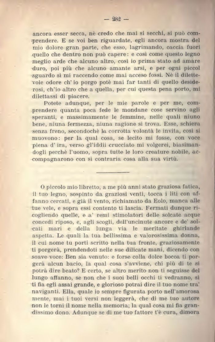 0 piccolo mio libretto, a me più anni stato graziosa fatica, il tuo legno, sospinto da graziosi venti, tocca i liti con affanno cercati, e già il vento, richiamato da Eolo, manca alle tue vele, e sopra essi contento ti lascia. Fermati dunque ri-cogliendo quelle, e a' remi stimolatori delle solcate acque concedi riposo, e, agli scogli, dell'uncinute ancore e de' solcati mari e della lunga via le meritate ghirlande aspetta. Le quali la tua bellissima e valorosissima donna, il cui nome tu porti scritto nella tua fronte, graziosamente ti porgerà, prendendoti nelle sue dilicate mani, dicendo con soave voce: Ben sia venuto: e forse colla dolce bocca ti porgerà alcun bacio, la qual cosa s'avviene, chi più di te si potrà dire beato? E certo, se altro merito non ti seguisse del lungo affanno, se non che i suoi belli occhi ti vedranno, sì ti fia egli assai grande, e glorioso potrai dire il tuo nome tra' naviganti. Ella, quale io sempre figurata porto nell'amorosa mente, mai i tuoi versi non leggerà, che di me tuo autore non le torni il nome nella memoria; la qual cosa mi fia grandissimo dono. Adunque se di me tuo fattore t'è cura, dimora