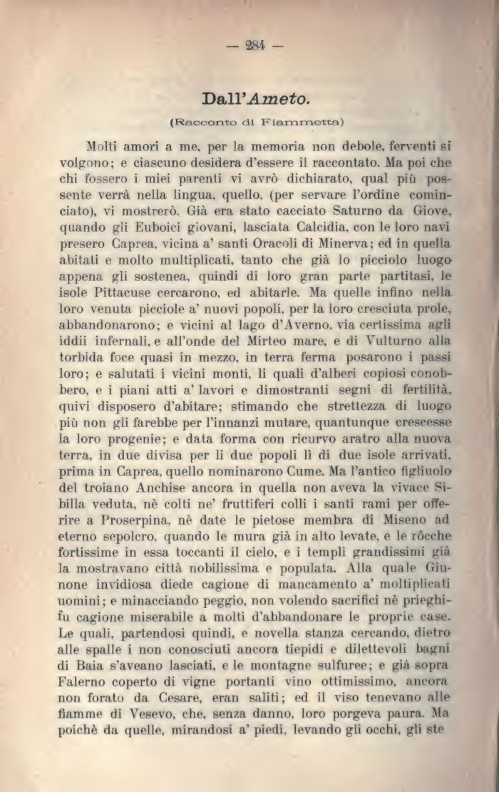 Molti amori a me, per la memoria non debole, ferventi si volgono; e ciascuno desidera d'essere il raccontato. Ma poi che chi fossero i miei parenti vi avrò dichiarato, qual più possente verrà nella lingua, quello, (per servare l'ordine cominciato), vi mostrerò. Già era stato cacciato Saturno da Giove, quando gli Euboici giovani, lasciata Calcidia. con le loro navi presero Caprea, vicina a' santi Oracoli di Minerva ; ed in quella abitali e molto inultiplicati, tanto che già lo picciolo luogo appena gli sostenea, quindi di loro gran parte partitasi, le isole Pittacuse cercarono, ed abitarle. Ma quelle infino nella loro venuta picciole a' nuovi popoli, per la loro cresciuta prole, abbandonarono; e vicini al lago d'i\ verno. via certissima agli iddìi infernali, e all'onde del Mirteo mare, e di Vulturno alla torbida foce quasi in mezzo, in terra ferma posarono i passi loro; e salutati i vicini monti, li quali d'alberi copiosi conobbero, e i piani atti a' lavori e dimostranti segni di fertilità, quivi disposero d'abitare; stimando che strettezza di luogo più non gli farebbe per l'innanzi mutare, quantunque crescesse la loro progenie; e data forma con ricurvo aratro alla nuova terra, in due divisa per li due popoli lì di due isole arrivati, prima in Caprea, quello nominarono Cume. Ma l'antico figliuolo del troiano Anchise ancora in quella non aveva la vivace Sibilla veduta, nè colti ne' fruttiferi colli i santi rami per offerire a Proserpina, nè date le pietose membra di Miseno ad eterno sepolcro, quando le mura già in alto levate, e le ròcche fortissime in essa toccanti il cielo, e i templi grandissimi già la mostravano città nobilissima e populala. Alla quale Giunone invidiosa diede cagione di mancamento a' moltiplicati uomini; e minacciando peggio, non volendo sacrifìci nè prieghi-fu cagione miserabile a molti d'abbandonare le proprie case. Le quali, partendosi quindi, e novella stanza cercando, dietro alle spalle i non conosciuti ancora tiepidi e dilettevoli bagni di Baia s'aveano lasciati, e le montagne sulfuree ; e già sopra Falerno coperto di vigne portanti vino ottimissimo, ancora non forato da Cesare, eran saliti; ed il viso tenevano alle fiamme di Vesevo, che, senza danno, loro porgeva paura. Ma poiché da quelle, mirandosi a' piedi, levando gli occhi, gli ste