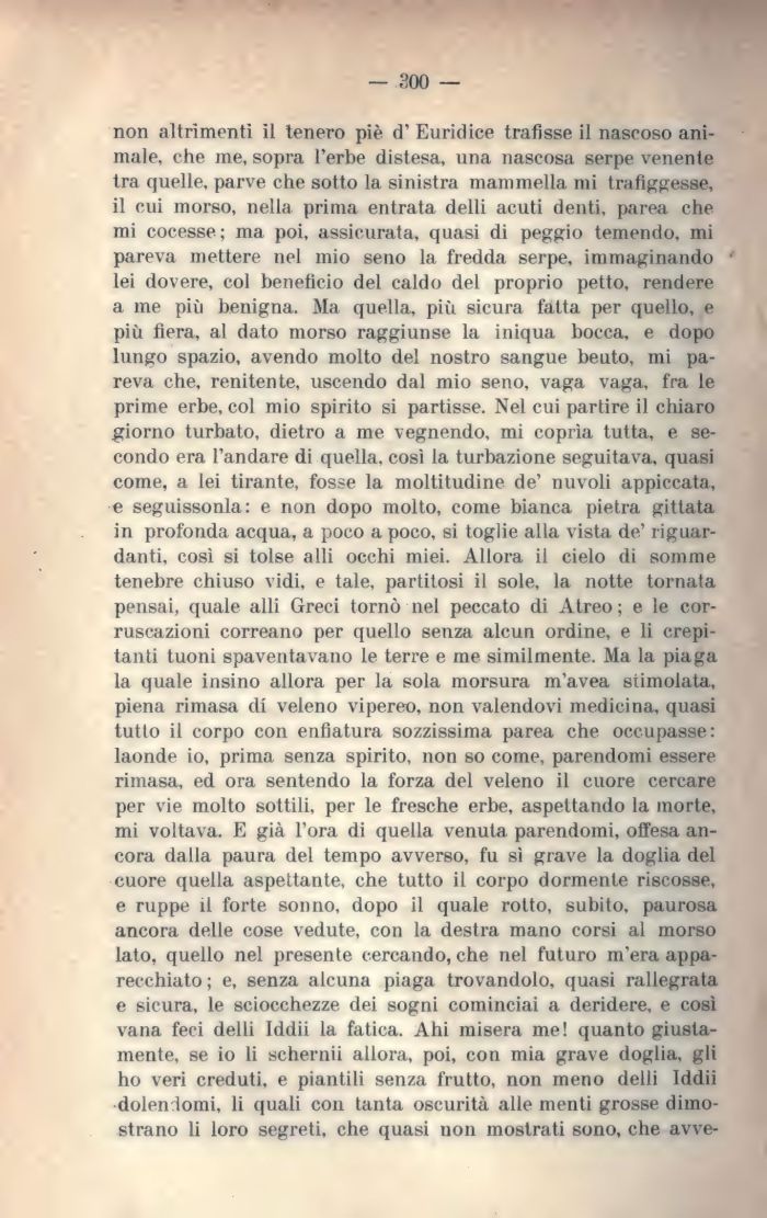 non altrimenti il tenero pie d' Euridice trafisse il nascoso animale, che me, sopra l'erbe distesa, una nascosa serpe venente tra quelle, parve che sotto la sinistra mammella mi trafiggesse, il cui morso, nella prima entrata delli acuti denti, parea che mi cocesse; ma poi, assicurata, quasi di peggio temendo, mi pareva mettere nel mio seno la fredda serpe, immaginando lei dovere, col beneficio del caldo del proprio petto, rendere a me più benigna. Ma quella, più sicura fatta per quello, e più fiera, al dato morso raggiunse la iniqua bocca, e dopo lungo spazio, avendo molto del nostro sangue beuto, mi pareva che, renitente, uscendo dal mio seno, vaga vaga, fra le prime erbe, col mio spirito si partisse. Nel cui partire il chiaro giorno turbato, dietro a me vegnendo, mi coprìa tutta, e secondo era l'andare di quella, così la turbazione seguitava, quasi come, a lei tirante, fosse la moltitudine de' nuvoli appiccata, e seguissonla: e non dopo molto, come bianca pietra gittata in profonda acqua, a poco a poco, si toglie alla vista de' riguardanti, cosi si tolse alli occhi miei. Allora il cielo di somme tenebre chiuso vidi, e tale, partitosi il sole, la notte tornata pensai, quale alli Greci tornò nel peccato di Atreo; e le corruscazioni correano per quello senza alcun ordine, e li crepitanti tuoni spaventavano le terre e me similmente. Ma la piaga la quale insino allora per la sola morsura m'avea stimolata, piena rimasa di veleno vipereo, non valendovi medicina, quasi tutto il corpo con enfiatura sozzissima parea che occupasse: laonde io, prima senza spirito, non so come, parendomi essere rimasa, ed ora sentendo la forza del veleno il cuore cercare per vie molto sottili, per le fresche erbe, aspettando la morte, mi voltava. E già l'ora di quella venuta parendomi, offesa ancora dalla paura del tempo avverso, fu sì grave la doglia del cuore quella aspettante, che tutto il corpo dormente riscosse, e ruppe il forte sonno, dopo il quale rotto, subito, paurosa ancora delle cose vedute, con la destra mano corsi al morso lato, quello nel presente cercando, che nel futuro m'era apparecchiato; e, senza alcuna piaga trovandolo, quasi rallegrata e sicura, le sciocchezze dei sogni cominciai a deridere, e così vana feci delli Iddii la fatica. Ahi misera me! quanto giustamente, se io li schernii allora, poi, con mia grave doglia, gli ho veri creduti, e piantili senza frutto, non meno delli Iddii dolendomi, li quali con tanta oscurità alle menti grosse dimostrano li loro segreti, che quasi non mostrati sono, che avve-
