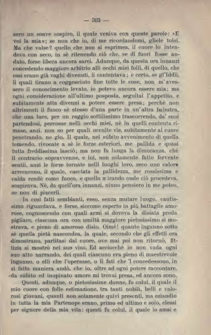 Questi, adunque, o pietosissime donne, fu colui, il quale il mio cuore con folle estimazione, tra tanti nobili, belli e valorosi giovani, quanti non solamente quivi presenti, ma eziandio in tutta la mia Partenope erano, primo ed ultimo e solo, elessi per signore della mia vita : questi fu colui, il quale io amai e