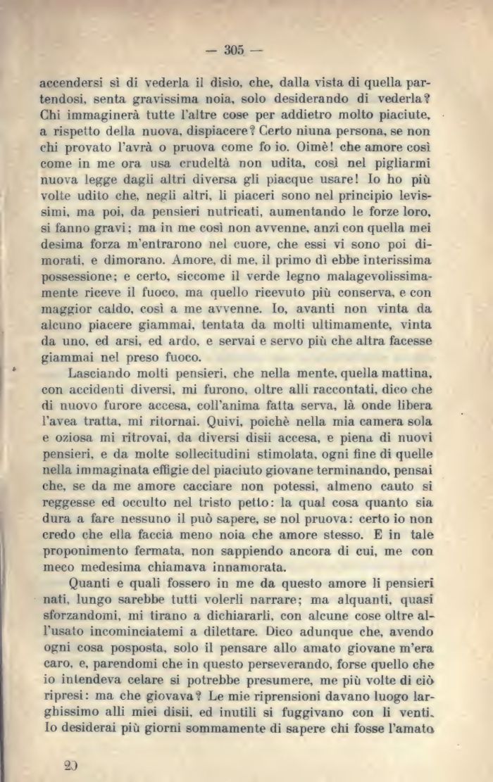Lasciando molti pensieri, che nella mente, quella mattina, con accidenti diversi, mi furono, oltre alli raccontati, dico che di nuovo furore accesa, coll'anima fatta serva, là onde libera l'avea tratta, mi ritornai. Quivi, poiché nella mia camera sola e oziosa mi ritrovai, da diversi disii accesa, e piena, di nuovi pensieri, e da molte sollecitudini stimolata, ogni fine di quelle nella immaginata effigie del piaciuto giovane terminando, pensai che, se da me amore cacciare non potessi, almeno cauto si reggesse ed occulto nel tristo petto: la qual cosa quanto sia dura a fare nessuno il può sapere, se noi pruova: certo io non credo che ella faccia meno noia che amore stesso. E in tale proponimento fermata, non sappiendo ancora di cui, me con meco medesima chiamava innamorata.
