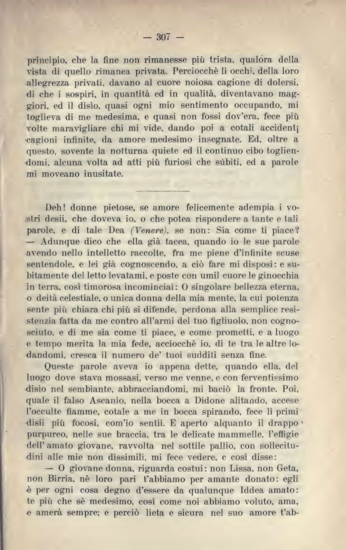 Deh! donne pietose, se amore felicemente adempia i vostri desii, che doveva io, o che potea rispondere a tante e tali parole, e di tale Dea (Venere), se non: Sia come ti piace? — Adunque dico che ella già tacea, quando io le sue parole avendo nello intelletto raccolte, fra me piene d'infinite scuse sentendole, e lei già cognoscendo, a ciò fare mi disposi: e subitamente del letto levatami, e poste con umil cuore le ginocchia in terra, così timorosa incominciai: O singolare bellezza eterna, o deità celestiale, o unica donna della mia mente, la cui potenza sente più chiara chi più si difende, perdona alla semplice resi-stenzia fatta da me contro all'armi del tuo figliuolo, non cogno-sciuto, e di me sia come ti piace, e come prometti, e a luogo e tempo merita la mia fede, acciocché io, di te tra le altre lodandomi, cresca il numero de' tuoi sudditi senza fine.
