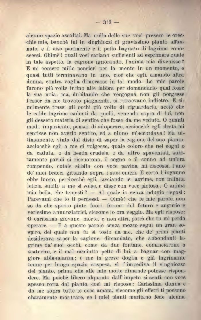 alcuno spazio ascoltai. Ma nulla delle sue voci presero le orecchie mie, benché lui in singhiozzi di gravissimo pianto affannato, e il viso parimente e il petto bagnato di lagrime conoscessi. Ohimè! quali voci sariano sufficienti ad esprimere quale in tale aspetto, la cagione ignorando, l'anima mia divenisse? E mi corsero mille pensieri per la mente in un momento, e quasi tutti terminavano in uno, cioè che egli, amando altra •donna, contra voglia dimorasse in tal modo. Le mie parole furono più volte infino alle labbra per domandarlo qual fosse la sua noia ; ma, dubitando che vergogna non gli porgesse l'esser da me trovato piagnendo, si ritraevano indietro. E similmente trassi gli occhi più volte di riguardarlo, acciò che le calde lagrime cadenti da quelli, venendo sopra di lui, non gli dessero materia di sentire che fosse da me veduto. O quanti modi, impaziente, pensai di adoperare, acciocché egli desta mi sentisse non averlo sentito, ed a niuno m'accordava! Ma ultimamente, vinta dal disio di saper la cagione del suo pianto, acciocché egli a me si volgesse, quale coloro che nei sogni o da caduta, o da bestia crudele, o da altro spaventati, subitamente pavidi si riscuotono, il sogno e il sonno ad un'ora rompendo, cotale sùbita con voce pavida mi riscossi, l'uno de' miei bracci gittando sopra i suoi omeri. E certo l'inganno ebbe luogo, perciocché egli, lasciando le lagrime, con infinita letizia subito a me si volse, e disse con voce pietosa : 0 anima mia bella, che temesti ? — Al quale io senza indugio risposi : Parevami che io ti perdessi. — Oimè ! che le mie parole, non so da che spirito pinte fuori, furono del futuro e augurio e verissime annunziatrici, siccome io ora veggio. Ma egli rispose: 0 carissima giovane, morte, e non altri, potrà che tu mi perda operare. — E a queste parole senza mezzo seguì un gran sospiro, del quale non fa si tosto da me, che de' primi pianti desiderava saper la cagione, dimandato, che abbondanti lagrime da' suoi occhi, come da due fontane, cominciarono a scaturire, e il mal rasciutto petto di lui, a bagnar con maggiore abbondanza ; e me in greve doglia e già lagrimante tenne per lungo spazio sospesa, sì l'impediva il singhiozzo del pianto, prima che alle mie molte dimande potesse rispondere. Ma poiché libero alquanto dall' impeto si sentì, con voce spesso rotta dal pianto, così mi rispose : Carissima donna e da me sopra tutte le cose amata, siccome gli effetti ti possono charamente mostrare, se i miei pianti meritano fede alcuna