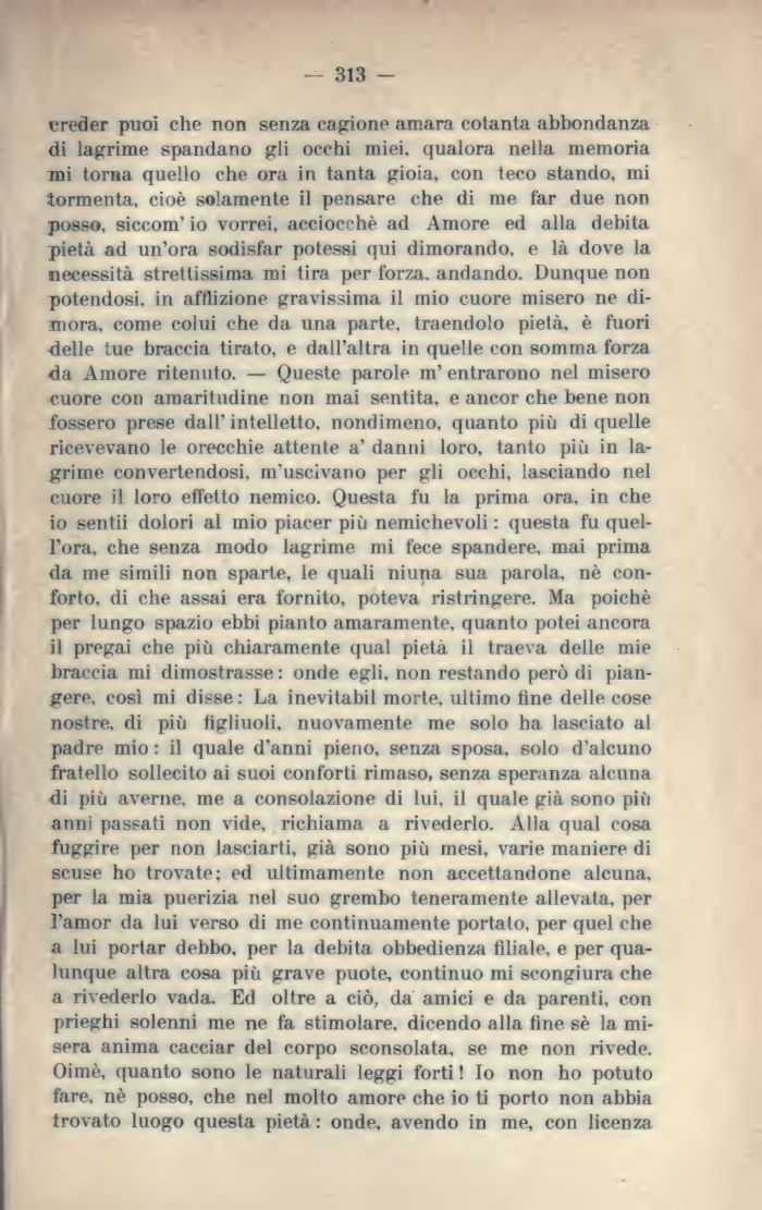 11 pregai che più chiaramente qual pietà il traeva delle mie braccia mi dimostrasse: onde egli, non restando però di piangere. così mi disse : La inevitabil morte, ultimo fine delle cose nostre, di più figliuoli, nuovamente me solo ha lasciato al padre mio : il quale d'anni pieno, senza sposa, solo d'alcuno fratello sollecito ai suoi conforti rimaso, senza speranza alcuna di più averne, me a consolazione di lui, il quale già sono più anni passati non vide, richiama a rivederlo. Alla qual cosa fuggire per non lasciarti, già sono più mesi, varie maniere di scuse ho trovate; ed ultimamente non accettandone alcuna, per la mia puerizia nel suo grembo teneramente allevata, per l'amor da lui verso di me continuamente portalo, per quel che a lui portar debbo, per la debita obbedienza filiale, e per qualunque altra cosa più grave puote, continuo mi scongiura che a rivederlo vada. Ed oltre a ciò, da amici e da parenti, con prieghi solenni me ne fa stimolare, dicendo alla fine sè la misera anima cacciar del corpo sconsolata, se me non rivede. Oimè, quanto sono le naturali leggi forti ! Io non ho potuto fare, nè posso, che nel molto amore che io ti porto non abbia trovato luogo questa pietà : onde, avendo in me, con licenza