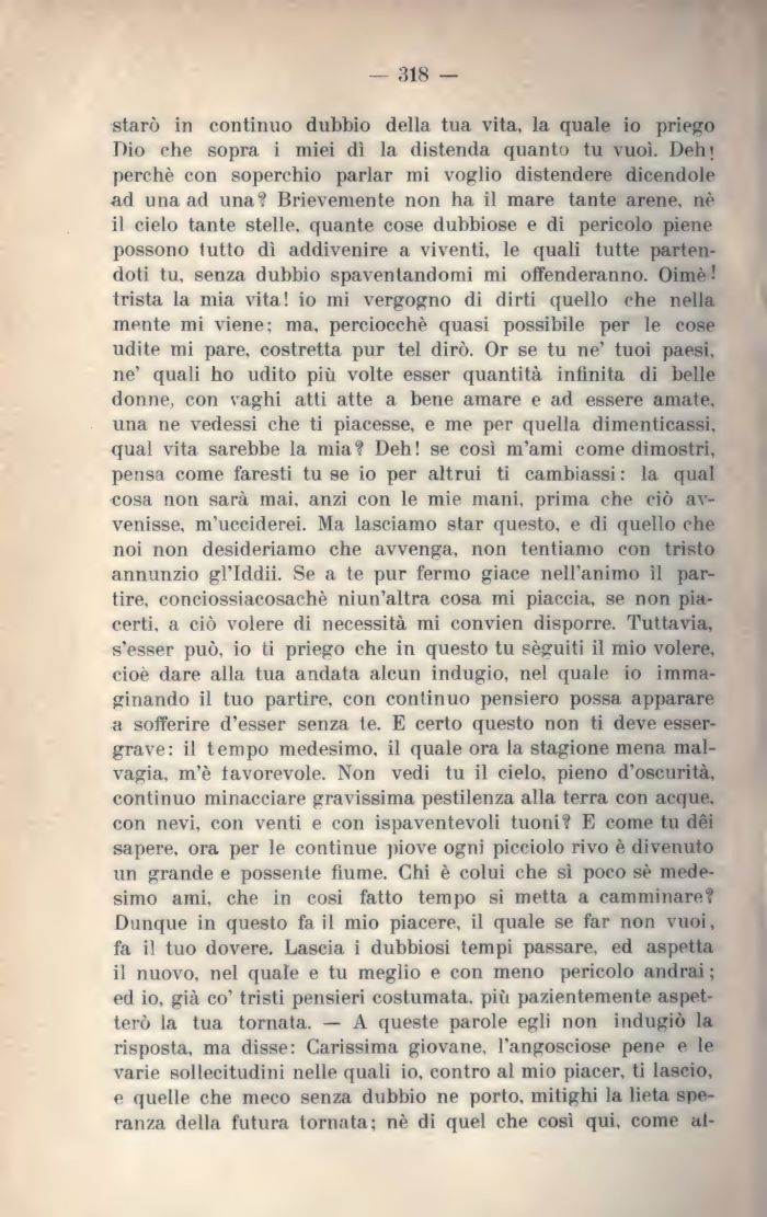 starò in continuo dubbio della tua vita, la quale io priego Dio che sopra i miei dì la distenda quanto tu vuoi. Deh; perchè con soperchio parlar mi voglio distendere dicendole ad una ad una? Brievemente non ha il mare tante arene, nè il cielo tante stelle, quante cose dubbiose e di pericolo piene possono tutto dì addivenire a viventi, le quali tutte partendoti tu, senza dubbio spaventandomi mi offenderanno. Oimè ! trista la mia vita! io mi vergogno di dirti quello che nella mente mi viene: ma, perciocché quasi possibile per le cose udite mi pare, costretta pur tei dirò. Or se tu ne' tuoi paesi, ne' quali ho udito più volte esser quantità infinita di belle donne, con vaghi atti atte a bene amare e ad essere amate, una ne vedessi che ti piacesse, e me per quella dimenticassi, qual vita sarebbe la mia? Deh! se così m'ami come dimostri, pensa come faresti tu se io per altrui ti cambiassi : la qual cosa non sarà mai, anzi con le mie mani, prima che ciò avvenisse, m'ucciderei. Ma lasciamo star questo, e di quello che noi non desideriamo che avvenga, non tentiamo con tristo annunzio gl'Iddìi. Se a te pur fermo giace nell'animo il partire, conciossiacosaché niun'altra cosa mi piaccia, se non piacerti. a ciò volere di necessità mi convien disporre. Tuttavia, s'esser può, io ti priego che in questo tu sèguiti il mio volere, cioè dare alla tua andata alcun indugio, nel quale io immaginando il tuo partire, con continuo pensiero possa apparare a sofferire d'esser senza te. E certo questo non ti deve esser-grave: il tempo medesimo, il quale ora la stagione mena malvagia, m'è favorevole. Non vedi tu il cielo, pieno d'oscurità, continuo minacciare gravissima pestilenza alla terra con acque, con nevi, con venti e con ispaventevoli tuoni? E come tu dèi sapere, ora per le continue piove ogni picciolo rivo è divenuto un grande e possente fiume. Chi è colui che sì poco sé medesimo ami, che in cosi fatto tempo si metta a camminare? Dunque in questo fa il mio piacere, il quale se far non vuoi, fa il tuo dovere. Lascia i dubbiosi tempi passare, ed aspetta il nuovo, nel quale e tu meglio e con meno pericolo andrai; ed io, già co' tristi pensieri costumata, più pazientemente aspetterò la tua tornata. — A queste parole egli non indugiò la risposta, ma disse: Carissima giovane, l'angosciose pene e le varie sollecitudini nelle quali io, contro al mio piacer, ti lascio, e quelle che meco senza dubbio ne porto, mitighi la lieta speranza della futura tornata; nè di quel che così qui, come al-