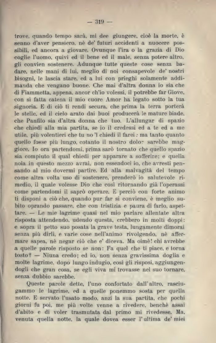 trove, quando tempo sarà, mi dee giungere, cioè la morte, è senno d'aver pensiero, nè de' futuri accidenti a nuocere possibili, ed ancora a giovare. Ovunque l'ira o la grazia di Dio coglie l'uomo, quivi ed il bene ed il male, senza potere altro, gli convien sostenere. Adunque tutte queste cose senza badare, nelle mani di lui, meglio di noi consapevole de' nostri bisogni, le lascia stare, ed a lui con prieghi solamente addi-manda che vengano buone. Che mai d'altra donna io sia che di Fiammetta, appena, ancor ch'io volessi, il potrebbe far Giove, con sì fatta catena il mio cuore Amor ha legato sotto la tua signoria. E di ciò ti rendi sec.ura. che prima la terra porterà le stelle, ed il cielo arato dai buoi producerà le mature biade, che Panfilo sia d'altra donna che tuo. L'allungar di spazio che chiedi alla mia partita, se io il credessi ed a te ed a me utile, più volentieri che tu no '1 chiedi il farei : ma tanto quanto quello fosse più lungo, cotanto il nostro dolor sarebbe maggiore. Io ora partendomi, prima sarò tornato che quello spazio sia compiuto il qual chiedi per apparare a sofferire; e quella noia in questo mezzo avrai, non essendoci io, che avresti pensando al mio dovermi partire. Ed alla malvagità del tempo come altra volta uso di sostenere, prenderò io salutevole rimedio, il quale volesse Dio che così ritornando già l'operassi come partendomi il saprò operare. E perciò con forte animo ti disponi a ciò che, quando pur far si conviene, è meglio subito oprando passare, che con tristizia e paura di farlo, aspettare. — Le mie lagrime quasi nel mio parlare allentate altra risposta attendendo, udendo questa, crebbero in molti doppi: e sopra il petto suo posata la grave testa, lungamente dimorai senza più dirli, e varie cose nell'animo rivolgendo, nè affermare sapea, nè negar ciò che e' diceva. Ma oimè! chi avrebbe a quelle parole risposto se non : Fa quel che ti piace, e torna tosto? — Niuna credo; ed io, non senza gravissima doglia e molte lagrime, dopo lungo indugio, così gli risposi, aggiungendogli che gran cosa, se egli viva mi trovasse nel suo tornare, senza dubbio sarebbe.