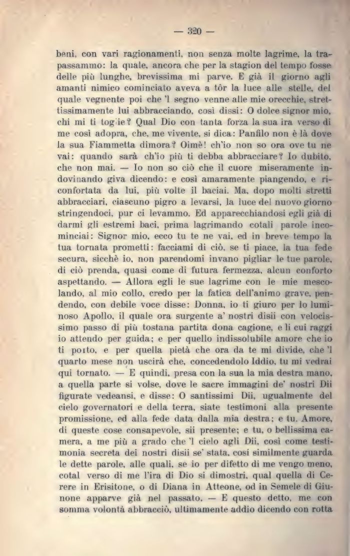beni, con vari ragionamenti, non senza molte lagrime, la trapassammo: la quale, ancora che per la stagion del tempo fosse delle più lunghe, brevissima mi parve. E già il giorno agli amanti nimico cominciato aveva a tòr la luce alle stelle, del quale vegnente poi che '1 segno venne alle mie orecchie, strettissimamente lui abbracciando, così dissi: 0 dolce signor mio, chi mi ti togiie? Qual Dio con tanta forza la sua ira verso di me così adopra, che, me vivente, si dica: Panfilo non è là dove la sua Fiammetta dimoraf Oimè! ch'io non so ora ove tu ne vai: quando sarà ch'io più ti debba abbracciare? Io dubito, che non mai. — Io non so ciò che il cuore miseramente indovinando giva dicendo: e così amaramente piangendo, e riconfortata da lui, più volte il baciai. Ma, dopo molti stretti abbracciari, ciascuno pigro a levarsi, la luce del nuovo giorno stringendoci, pur ci levammo. Ed apparecchiandosi egli già di darmi gli estremi baci, prima lagrimando cotali parole incominciai : Signor mio, ecco tu te ne vai, ed in breve tempo la tua tornata prometti: facciami di ciò, se ti piace, la tua fede secura, sicché io, non parendomi invano pigliar le tue parole, di ciò prenda, quasi come di futura fermezza, alcun conforto aspettando. — Allora egli le sue lagrime con le mie mescolando, al mio collo, credo pei la fatica dell'animo grave, pendendo, con debile voce disse: Donna, io ti giuro per lo luminoso Apollo, il quale ora surgente a' nostri disii con velocissimo passo di più tostana partita dona cagione, e li cui raggi io attendo per guida; e per quello indissolubile amore che io ti poito, e per quella pietà che ora da te mi divide, che '1 quarto mese non uscirà che, concedendolo Iddio, tu mi vedrai qui tornato. — E quindi, presa con la sua la mia destra mano, a quella parte si volse, dove le sacre immagini de' nostri Dii figurate vedeansi, e disse: 0 santissimi Dii, ugualmente del cielo governatori e della terra, siate testimoni alla presente promissione, ed alla fede data dalla mia destra; e tu. Amore, di queste cose consapevole, sii presente; e tu, o bellissima camera, a me più a grado che '1 cielo agli Dii, così come testimonia secreta dei nostri disii se' stata, cosi similmente guarda le dette parole, alle quali, se io per difetto di me vengo meno, cotal verso di me l'ira di Dio si dimostri, qual quella di Cerere in Erisitone, o di Diana in Atteone, od in Semele di Giunone apparve già nel passato. — E questo detto, me con somma volontà abbracciò, ultimamente addio dicendo con rotta