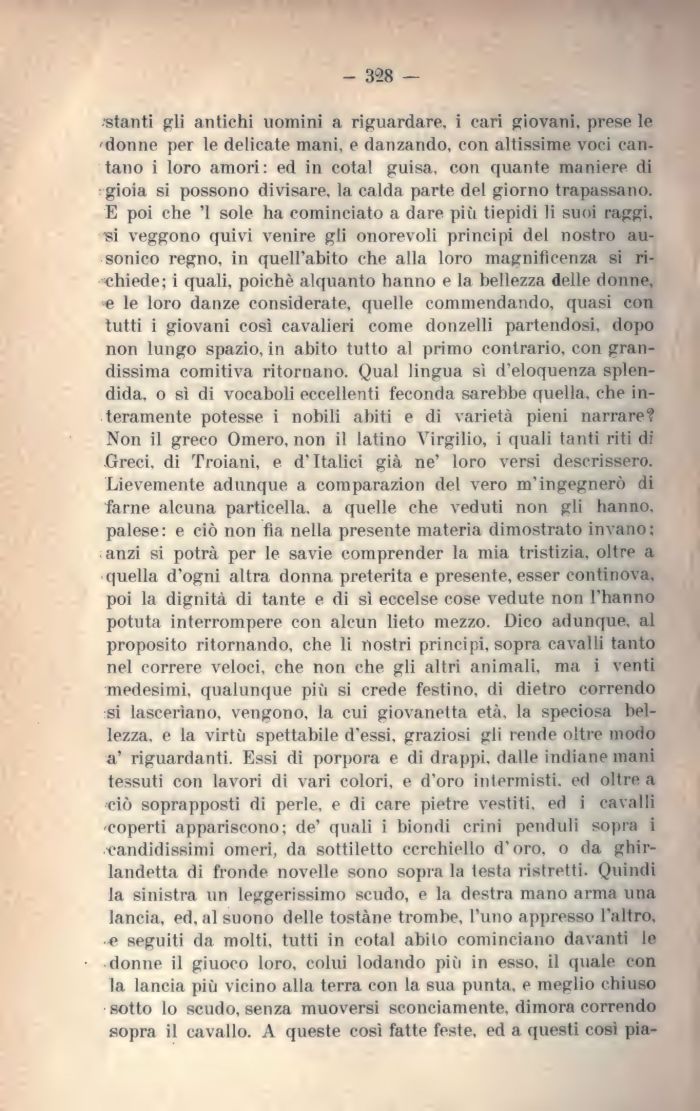 •stanti gli antichi uomini a riguardare, i cari giovani, prese le donne per le delicate mani, e danzando, con altissime voci cantano i loro amori: ed in cotal guisa, con quante maniere di gioia si possono divisare, la calda parte del giorno trapassano. E poi che '1 sole ha cominciato a dare più tiepidi li suoi raggi, •si veggono quivi venire gli onorevoli principi del nostro au-sonico regno, in quell'abito che alla loro magnificenza si richiede; i quali, poiché alquanto hanno e la bellezza delle donne, e le loro danze considerate, quelle commendando, quasi con tutti i giovani così cavalieri come donzelli partendosi, dopo non lungo spazio, in abito tutto al primo contrario, con grandissima comitiva ritornano. Qual lingua sì d'eloquenza splendida, o si di vocaboli eccellenti feconda sarebbe quella, che interamente potesse i nobili abiti e di varietà pieni narrare? Non il greco Omero, non il latino Virgilio, i quali tanti riti di -Greci, di Troiani, e d'Italici già ne' loro versi descrissero. Lievemente adunque a comparazion del vero m'ingegnerò di farne alcuna particella, a quelle che veduti non gli hanno, palese: e ciò non fìa nella presente materia dimostralo invano; anzi si potrà per le savie comprender la mia tristizia, oltre a quella d'ogni altra donna preterita e presente, esser continova, poi la dignità di tante e di sì eccelse cose vedute non l'hanno potuta interrompere con alcun lieto mezzo. Dico adunque, al proposito ritornando, che li nostri principi, sopra cavalli tanto nel correre veloci, che non che gli altri animali, ma i venti medesimi, qualunque più si crede festino, di dietro correndo si lascerìano, vengono, la cui giovanetta età, la speciosa bellezza, e la virtù spettabile d'essi, graziosi gli rende oltre modo a' riguardanti. Essi di porpora e di drappi, dalle indiane mani tessuti con lavori di vari colori, e d'oro intermisti. ed oltre a ciò soprapposti di perle, e di care pietre vestiti, ed i cavalli -coperti appariscono; de' quali i biondi crini penduli sopra i candidissimi omeri, da sottiletto cerchiello d'oro, o da ghirlandata di fronde novelle sono sopra la testa ristretti. Quindi la sinistra un leggerissimo scudo, e la destra mano arma una lancia, ed, al suono delle tostàne trombe, l'uno appresso l'altro, e seguiti da molti, tutti in cotal abito cominciano davanti le donne il giuoco loro, colui lodando più in esso, il quale con la lancia più vicino alla terra con la sua punta, e meglio chiuso sotto lo scudo, senza muoversi sconciamente, dimora correndo sopra il cavallo. A queste così fatte feste, ed a questi così pia-