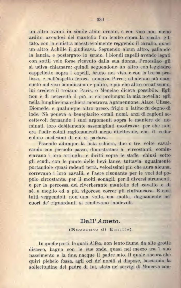un altro avanti in simile abito ornato, e con viso non meno ardito, avendosi del mantello l'un lembo sopra la spalla pittato, con la sinistra maestrevolmente reggendo il cavallo, quasi un altro Achille il giudicava. Seguendo alcun altro, pallando la lancia, e postergato lo scudo, i biondi capelli avendo legati con sottil velo forse ricevuto dalla sua donna, Protesilao gli si udiva chiamare : quindi seguendone un altro con leggiadro cappelletto sopra i capelli, bruno nel viso, e con la barba prolissa, e nell'aspetto feroce, nomava Pirro ; ed alcuno più mansueto nel viso biondissimo e pulito, e più che altro ornatissimo, lui credere il troiano Paris, o Menelao diceva possibile. Egli non è di necessità il più in ciò prolungar la mia novella: egli nella lunghissima schiera mostrava Agamennone, Aiace, Ulisse, Diomede, e qualunque altro greco, frigio o latino fu degno di lode. Nè poneva a beneplacito cotali nomi, anzi di ragioni ac-cettevoli fermando i suoi argomenti sopra le maniere de' nominati, loro debitamente assomigliati mostrava: per che non era l'udir cotali ragionamenti meno dilettevole, che il veder coloro medesimi di cui si parlava.