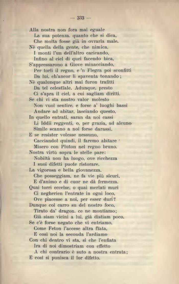 S'appressarono a Giove minacciando, Per torli il regno, e 'n Flegra poi sconfitti Da lui, ch'ancor li spaventa tonando ;