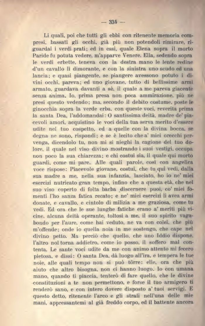 Li quali, poi che tutti gli ebbi con ritenente memoria compresi, bassati gli occhi, già più non potendoli rimirare, riguardai i verdi prati; ed in essi, quale Elena sopra il morto Paride fu potuta vedere, m'apparve Venere. Ella, sedendo sopra le verdi erbette, teneva con la destra mano le lente redine d'un cavallo lì dimorante, e con la sinistra uno scudo ed una lancia; e quasi piangente, se piangere avessono potuto i divini occhi, pareva; ed uno giovane, tutto di bellissime armi armato, guardava davanti a sè. il quale a me pareva giacente senza anima. Io, prima presa non poca ammirazione, più ne presi questo vedendo; ma, secondo il debito costume, poste le ginocchia sopra la verde erba, con queste voci, reverita prima la santa Dea, l'addomandai : 0 santissima deità, madre de'piacevoli amori, acquistino le voci della tua serva merito d'essere udite nel tuo cospetto, ed a quelle con la divina bocca, se degna ne sono, rispondi; e se è lecito chea' miei orecchi pervenga, dicendolo tu, non mi si nieghi la cagione del tuo dolore, il quale nel viso divino mostrando i suoi vestigi, occupa non poco la sua chiarezza; e chi costui sia, il quale qui morto guardi, come mi pare. Alle quali parole, così con angelica voce rispose: Piacevole giovane, costui, che tu qui vedi, dalla sua madre a me, nella sua infanzia, lasciato, ho io ne' miei esercizi nutricato gran tempo, intìno che a questa età, che nel suo viso coperto di folta barba discernere puoi, co' miei fomenti l'ho sanza fatica recato; e ne' miei esercizi li avea armi donate, e cavallo, e cintolo di milizia a me graziosa, come tu vedi. Ed ora che le sue lunghe fatiche erano a' meriti più vicine, alcuna deità operante, toltosi a me, il suo spirito vagabondo per l'aure, come hai veduto, ne va con colei, che più m'offende; onde io quella noia in me sostengo, che cape nel divino petto. Ma perciò che quello, che uno Iddio dispone, l'altro noi torna addietro, come io posso, il soffero mal contenta. Le sante voci udite da me con animo attento mi fecero pietosa, e dissi: 0 santa Dea, dà luogo all'ira, e tempera le tue noie, alle quali tempo non si può tórre: elle, ora che più aiuto che altro bisogna, non ci hanno luogo. Io con umana mano, quando ti piaccia, tenterò di fare quello, che le divine constituzioni a te non permettono, e forse il tuo armigero ti renderò sano, e con intero dovere disposto a' tuoi servigi. E questo detto, ritenente l'arco e gli strali nell'una delle mie mani, appressatemi al già freddo corpo, ed il battente ancora ![]() |
