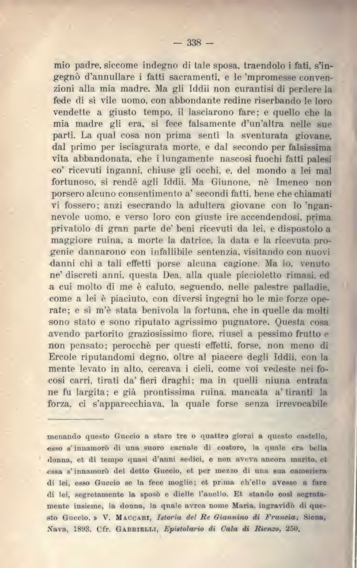 menando questo Guccio a stare tre o quattro giorni a questo castello, esso s'innamorò di una suoro carnale di costoro, la quale era bella donna, et di tempo quasi d'anni sedici, e non aveva ancora marito, et essa s'innamorò del detto Guccio, et per mezzo di una sua cameriera di lei, esso Guccio se la fece moglie; et prima cb'ello avesse a fare di lei, segretauiente la sposò e dielle l'anello. Et stando cosi segrata-mente insieme, la donna, la quale avrea nome Maria, ingravidò di questo Guccio. ^ V. Maccabi, Intorni del Re Giannino di Francia, Siena, Xava, 1893. Cfr. Gabrieli.i, Epistolario di Cala di Rienzo, 250.