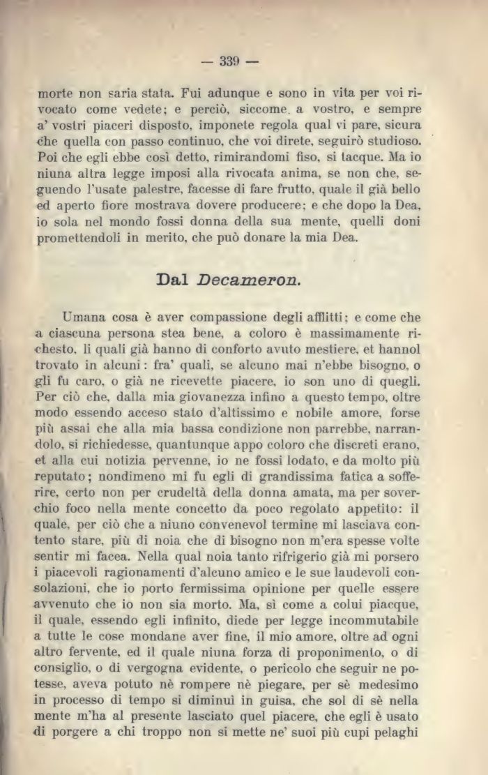 Umana cosa è aver compassione degli afflitti; e come che a ciascuna persona stea bene, a coloro è massimamente ri-chesto. li quali già hanno di conforto avuto mestiere, et hannol trovato in alcuni : fra' quali, se alcuno mai n'ebbe bisogno, o gli fu caro, o già ne ricevette piacere, io son uno di quegli. Per ciò che, dalla mia giovanezza infìno a questo tempo, oltre modo essendo acceso stato d'altissimo e nobile amore, forse più assai che alla mia bassa condizione non parrebbe, narrandolo, si richiedesse, quantunque appo coloro che discreti erano, et alla cui notizia pervenne, io ne fossi lodato, e da molto più reputato ; nondimeno mi fu egli di grandissima fatica a soffe-rire, certo non per crudeltà della donna amata, ma per soverchio foco nella mente concetto da poco regolato appetito: il quale, per ciò che a niuno convenevol termine mi lasciava contento stare, più di noia che di bisogno non m'era spesse volte sentir mi facea. Nella qual noia tanto rifrigerio già mi porsero i piacevoli ragionamenti d'alcuno amico e le sue laudevoli consolazioni, che io porto fermissima opinione per quelle essere avvenuto che io non sia morto. Ma, sì come a colui piacque, il quale, essendo egli infinito, diede per legge incommutabile a tutte le cose mondane aver fine, il mio amore, oltre ad ogni altro fervente, ed il quale niuna forza di proponimento, o di consiglio, o di vergogna evidente, o pericolo che seguir ne potesse, aveva potuto nè rompere nè piegare, per sè medesimo in processo di tempo si diminuì in guisa, che sol di sè nella mente m'ha al presente lasciato quel piacere, che egli è usato di porgere a chi troppo non si mette ne' suoi più cupi pelaghi