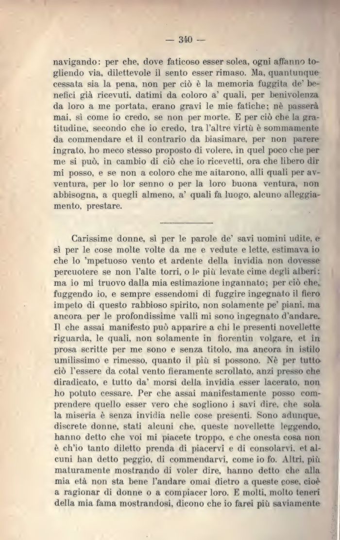 Carissime donne, sì per le parole de' savi uomini udite, e sì per le cose molte volte da me e vedute e lette, estimava io che lo 'mpetuoso vento et ardente della invidia non dovesse percuotere se non l'alte torri, o le più levate cime degli alberi: ma io mi truovo dalla mia estimazione ingannato; per ciò che, fuggendo io, e sempre essendomi di fuggire ingegnato il fiero impeto di questo rabbioso spirito, non solamente pe' piani, ma ancora per le profondissime valli mi sono ingegnato d'andare-Il che assai manifesto può apparire a chi le presenti novellette riguarda, le quali, non solamente in fiorentin volgare, et in prosa scritte per me sono e senza titolo, ma ancora in istilo umilissimo e rimesso, quanto il più si possono. Nè per tutto ciò l'essere da cotal vento fieramente scrollato, anzi presso che diradicato, e tutto da' morsi delia invidia esser lacerato, non ho potuto cessare. Per che assai manifestamente posso comprendere quello esser vero che sogliono i savi dire, che sola la miseria è senza invidia nelle cose presenti. Sono adunque, discrete donne, stati alcuni che, queste novellette leggendo, hanno detto che voi mi piacete troppo, e che onesta cosa non è ch'io tanto diletto prenda di piacervi e di consolarvi, et alcuni han detto peggio, di commendarvi, come io fo. Altri, più maturamente mostrando di voler dire, hanno detto che alla mia età non sta bene l'andare ornai dietro a queste cose, cioè a ragionar di donne o a compiacer loro. E molti, molto teneri della mia fama mostrandosi, dicono che io farei più saviamente