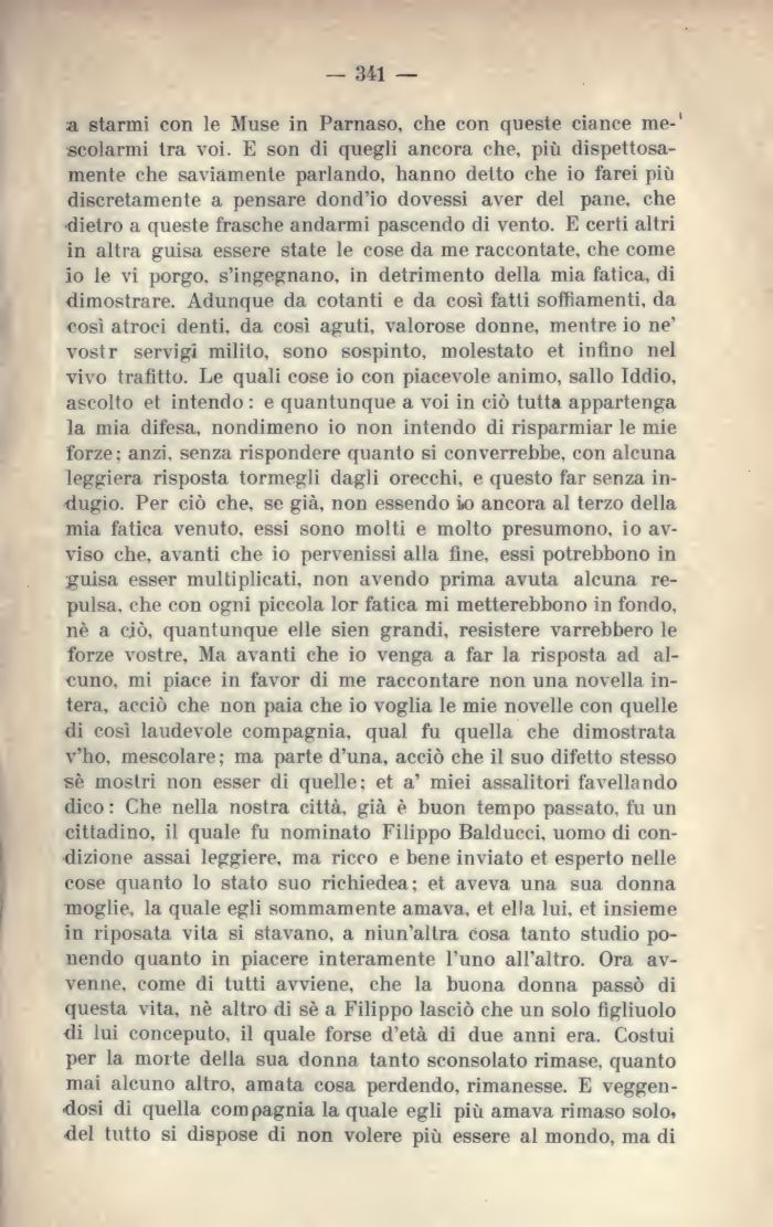 a starmi con le Muse in Parnaso, che con queste ciance me-' scolarmi tra voi. E son di quegli ancora che, più dispettosamente che saviamente parlando, hanno detto che io farei più discretamente a pensare dond'io dovessi aver del pane, che ¦dietro a queste frasche andarmi pascendo di vento. E certi altri in altra guisa essere state le cose da me raccontate, che come io le vi porgo, s'ingegnano, in detrimento della mia fatica, di dimostrare. Adunque da cotanti e da così fatti soffiamenti, da così atroci denti, da così aguti, valorose donne, mentre io ne' vostr servigi milito, sono sospinto, molestato et infino nel vivo trafitto. Le quali cose io con piacevole animo, sallo Iddio, ascolto et intendo : e quantunque a voi in ciò tutta appartenga la mia difesa, nondimeno io non intendo di risparmiar le mie forze; anzi, senza rispondere quanto si converrebbe, con alcuna leggiera risposta tormegli dagli orecchi, e questo far senza indugio. Per ciò che, se già, non essendo io ancora al terzo della mia fatica venuto, essi sono molti e molto presumono, io avviso che, avanti che io pervenissi alla fine, essi potrebbono in guisa esser multiplicati, non avendo prima avuta alcuna repulsa, che con ogni piccola lor fatica mi metterebbono in fondo, nè a ciò, quantunque elle sien grandi, resistere varrebbero le forze vostre, Ma avanti che io venga a far la risposta ad alcuno, mi piace in favor di me raccontare non una novella intera, acciò che non paia che io voglia le mie novelle con quelle di così laudevole compagnia, qual fu quella che dimostrata v'ho, mescolare; ma parte d'una, acciò che il suo difetto stesso sè mostri non esser di quelle: et a' miei assalitori favellando dico : Che nella nostra città, già è buon tempo passato, fu un cittadino, il quale fu nominato Filippo Balducci, uomo di condizione assai leggiere, ma ricco e bene inviato et esperto nelle cose quanto lo stato suo richiedea; et aveva una sua donna moglie, la quale egli sommamente amava, et ella lui, et insieme in riposata vita si stavano, a niun'altra cosa tanto studio ponendo quanto in piacere interamente l'uno all'altro. Ora avvenne, come di tutti avviene, che la buona donna passò di questa vita, nè altro di sè a Filippo lasciò che un solo figliuolo di lui conceputo, il quale forse d'età di due anni era. Costui per la morte della sua donna tanto sconsolato rimase, quanto mai alcuno altro, amata cosa perdendo, rimanesse. E veggen-dosi di quella compagnia la quale egli più amava rimaso solo, del tutto si dispose di non volere più essere al mondo, ma di