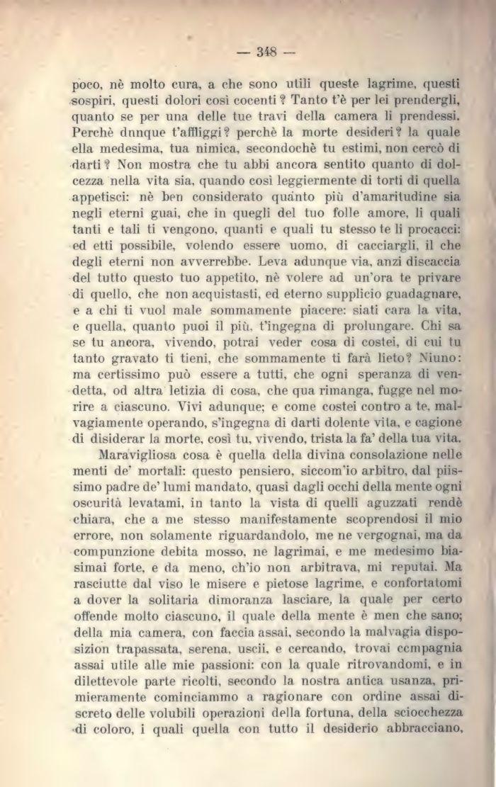 poco, nè molto cura, a che sono utili queste lagrime, questi sospiri, questi dolori così cocenti ? Tanto t'è per lei prendergli, quanto se per una delle tue travi della camera li prendessi. Perchè dnnque t'affliggi? perchè la morte desideri? la quale ella medesima, tua nimica, secondochè tu estimi, non cercò di darti ? Non mostra che tu abbi ancora sentito quanto di dolcezza nella vita sia, quando così leggiermente di torti di quella appetisci: nè ben considerato quanto più d'amaritudine sia negli eterni guai, che in quegli del tuo folle amore, li quali tanti e tali ti vengono, quanti e quali tu stesso te li procacci: ed etti possibile, volendo essere uomo, di cacciargli, il che degli eterni non avverrebbe. Leva adunque via, anzi discaccia dei tutto questo tuo appetito, nè volere ad un'ora te privare di quello, che non acquistasti, ed eterno supplicio guadagnare, e a chi ti vuol male sommamente piacere: siati cara la vita, e quella, quanto puoi il più, t'ingegna di prolungare. Chi sa se tu ancora, vivendo, potrai veder cosa di costei, di cui tu tanto gravato ti tieni, che sommamente ti farà lieto? Niuno: ma certissimo può essere a tutti, che ogni speranza di vendetta, od altra letizia di cosa, che qua rimanga, fugge nel morire a ciascuno. Vivi adunque; e come costei contro a te, malvagiamente operando, s'ingegna di darti dolente vita, e cagione di disiderar la morte, così tu, vìvendo, trista la fa' della tua vita.