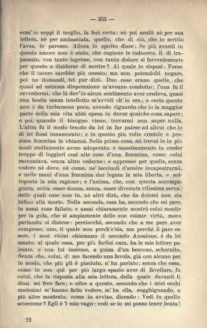 •coni' io seppi il meglio, la feci certa : nè poi sentii nè per sua lettera, nè per ambasciata, quello, che di ciò, che io scritto l'avea, le paresse. Allora lo spirito disse : Se più avanti in questo amore non è stato, che cagione te induceva il dì trapassato, con tante lagrime, con tanto dolore sì ferventemente per questo a disiderar di morire ? Al quale io risposi : Forse ehe il tacere sarebbe più onesto; ma non potendolti negare, poi ne domandi, tei pur dirò. Due cose erano quelle, che quasi ad estrema disperazione m'aveano condotto : l'una fu il ravvedermi, che là dov' io alcun sentimento aver credeva, quasi una bestia senza intelletto m'avvidi eh' io era ; e certo questo non è da turbarsene poco, avendo riguardo che io la maggior parte della mia vita abbi spesa in dover qualche cosa sapere; e poi, quando il bisogno viene, trovarmi non saper nulla. L'altra fu il modo tenuto da lei in far palese ad altrui che io di lei fossi innamorato; e in questo più volte crudele e pessima femmina la chiamai. Nella prima cosa, mi trovai io in più modi stoltamente avere adoperato, e massimamente in creder troppo di leggieri così alte cose d'una femmina, come colui raccontava, senza altro vederne : e appresso per quelle, senza vedere nè dove, nè come, ne' lacciuoli d'amóre incapestrarmi, e nelle mani d'una femmina dar legata la mia libertà, e sottoposta la mia ragione; e l'anima, che, con questa accompagnata. solea esser donna, senza, esser divenuta vilissima serva : delle quali cose non tu, nè altri dirà, che da dolersi non sia inflno alla morte. Nella seconda, essa ha, secondo che mi pare, in assai cose fallato, e assai chiaramente mostrò colui mentir per la gola, che sì ampiamente delle sue esimie virtù, meco parlando, si distese : perciocché, secondo che a me pare aver compieso, uno, il quale non perch'e'sia, ma perchè li pare essere. i suoi vicini chiamano il secondo Ansalone, è da lei amato, al quale essa, per più farlisi cara, ha le mie lettere palesate. e con lui insieme, a guisa d'un beccone, schernito. Senza che, colui, di me facendo una favola, già con alcuno per lo modo, che più gli è piaciuto, n'ha parlato; senza che esso, come io son qui per più largo spazio aver di favellare, fu colui, che la risposta alla mia lettera, della quale davanti ti dissi, mi fece fare; e oltre a questo, secondo che i miei occhi medesimi m' hanno fatto vedere, m' ha ella, sogghignando, a piti altre mostrato, come io avviso, dicendo : Vedi tu quello scioccone? Egli è '1 mio vago: vedi se io mi posso tener beata!
