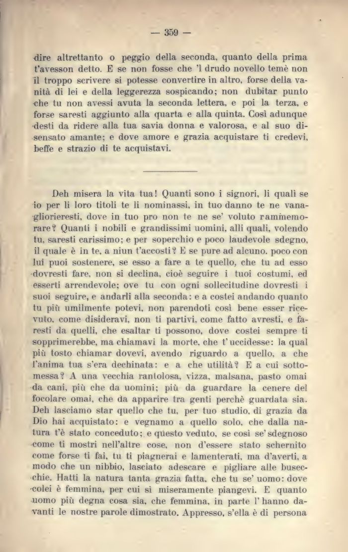11 quale è in le, a niun t'accosti? E se pure ad alcuno, poco con lui puoi sostenere, se esso a fare a te quello, che tu ad esso dovresti fare, non si declina, cioè seguire i tuoi costumi, ed esserti arrendevole; ove tu con ogni sollecitudine dovresti i suoi seguire, e andarli alla seconda : e a costei andando quanto tu più umilmente potevi, non parendoti così bene esser ricevuto. come disideravi, non ti partivi, come fatto avresti, e faresti da quelli, che esaltar ti possono, dove costei sempre ti sopprimerebbe, ma chiamavi la morte, che t'uccidesse: la qual più tosto chiamar dovevi, avendo riguardo a quello, a che l'anima tua s'era dechinata: e a che utilità? E a cui sottomessa? A una vecchia rantolosa, vizza, malsana, pasto ornai da cani, più che da uomini; più da guardare la cenere del focolare ornai, che da apparire tra genti perchè guardata sia. Deh lasciamo star quello che tu, per tuo studio, di grazia da Dio hai acquistato: e vegnamo a quello solo, che dalla natura t'è stato conceduto; e questo veduto, se così se'sdegnoso come ti mostri nell'altre cose, non d'essere stato schernito come forse ti fai, tu ti piagnerai e lamenterati, ma d'averti, a modo che un nibbio, lasciato adescare e pigliare alle busec-chie. Hatti la natura tanta grazia fatta, che tu se' uomo: dove •colei è femmina, per cui sì miseramente piangevi. E quanto uomo più degna cosa sia, che femmina, in parte l'hanno davanti le nostre parole dimostrato. Appresso, s'ella è di persona